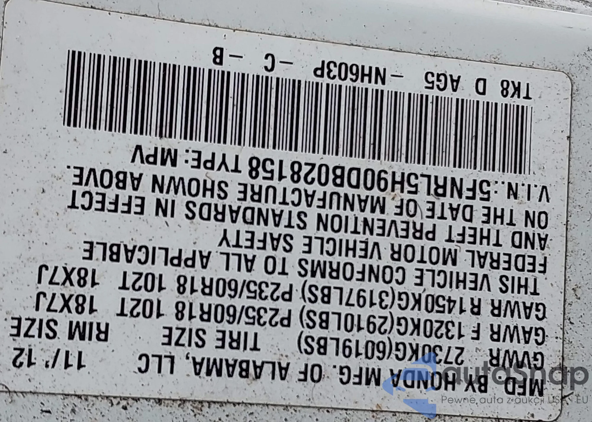 • VIN 5FNRL5H90DB028158
