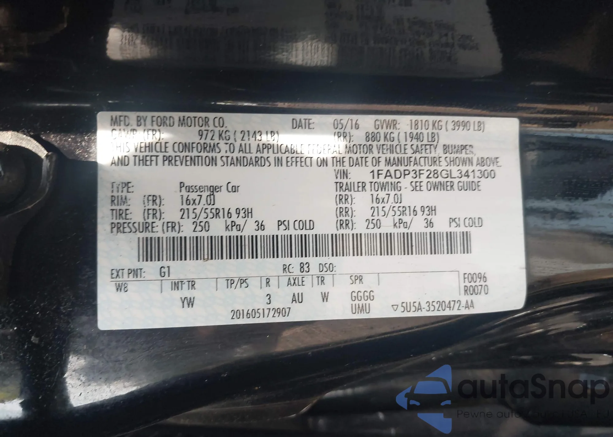 LOT: 42904281 VIN: 1FADP3F28GL341300