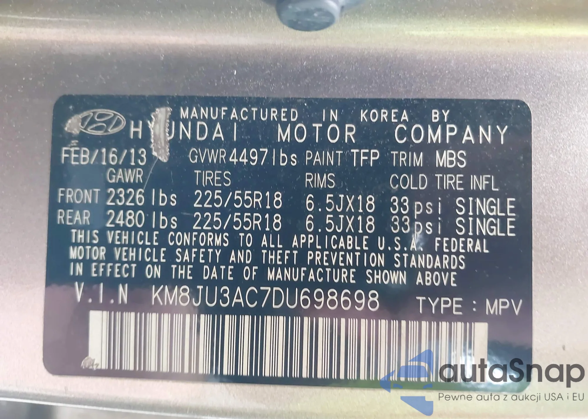 LOT: 42924903 VIN: KM8JU3AC7DU698698