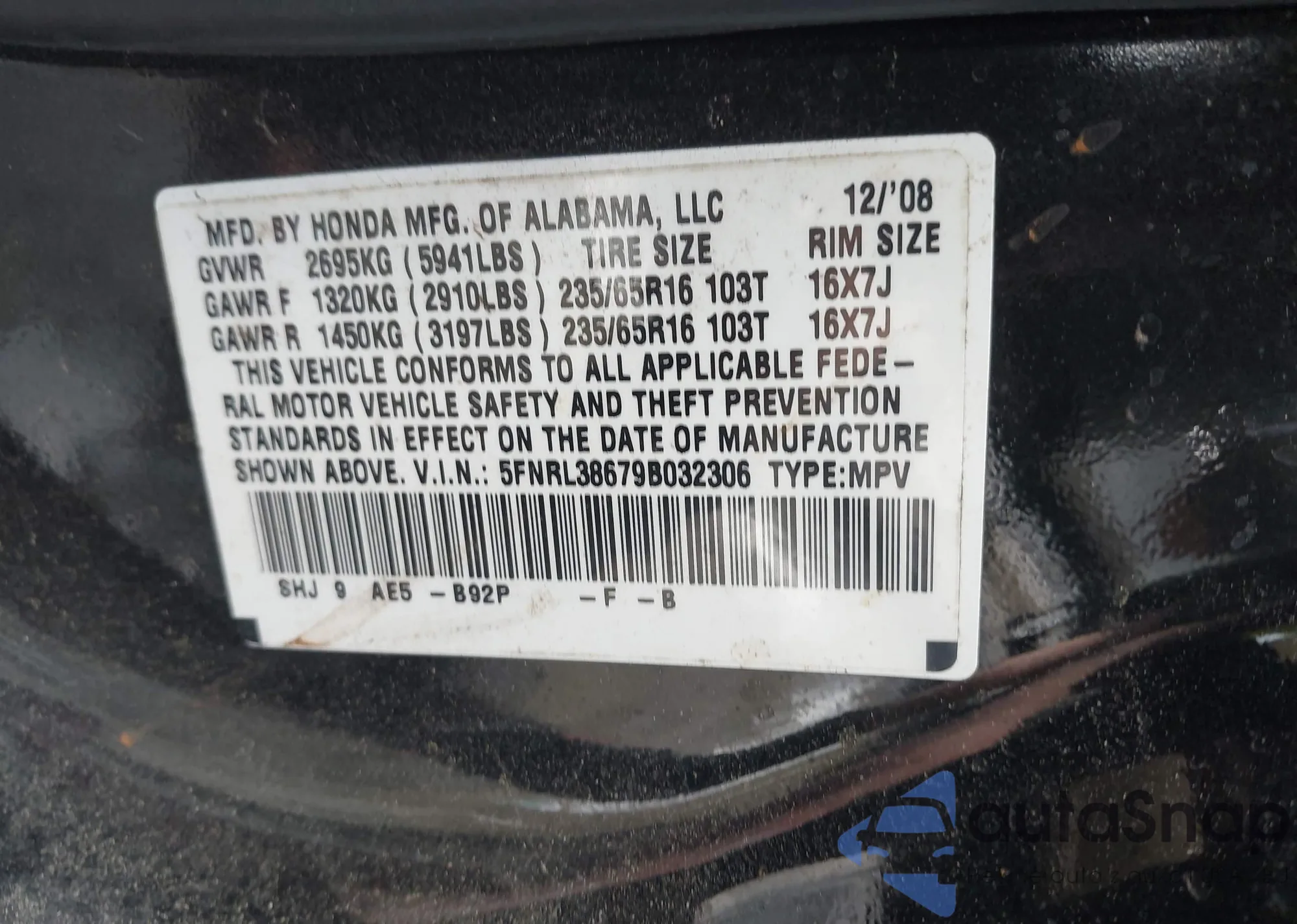 • VIN 5FNRL38679B032306