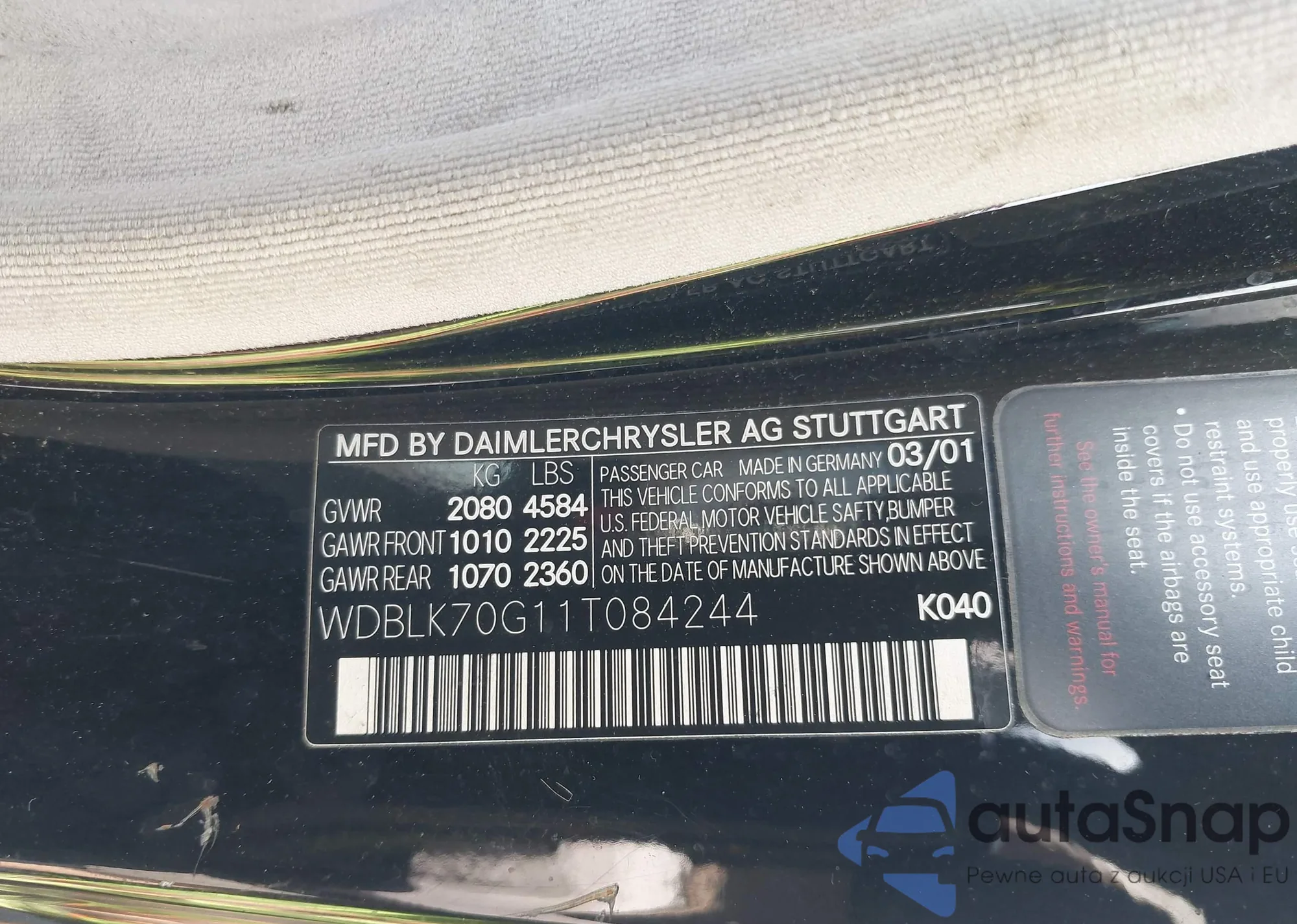 LOT: 43107114 VIN: WDBLK70G11T084244