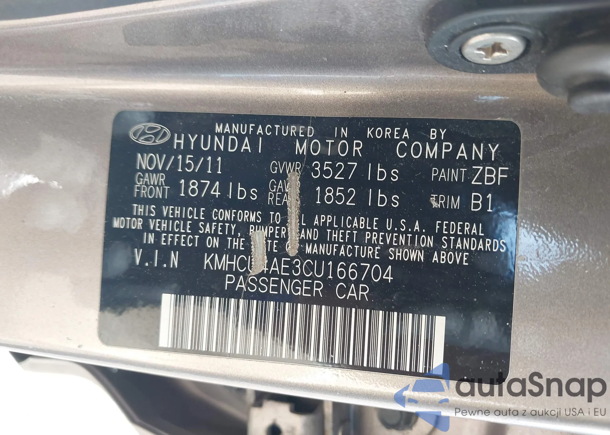 LOT: 43203064 VIN: KMHCU4AE3CU166704