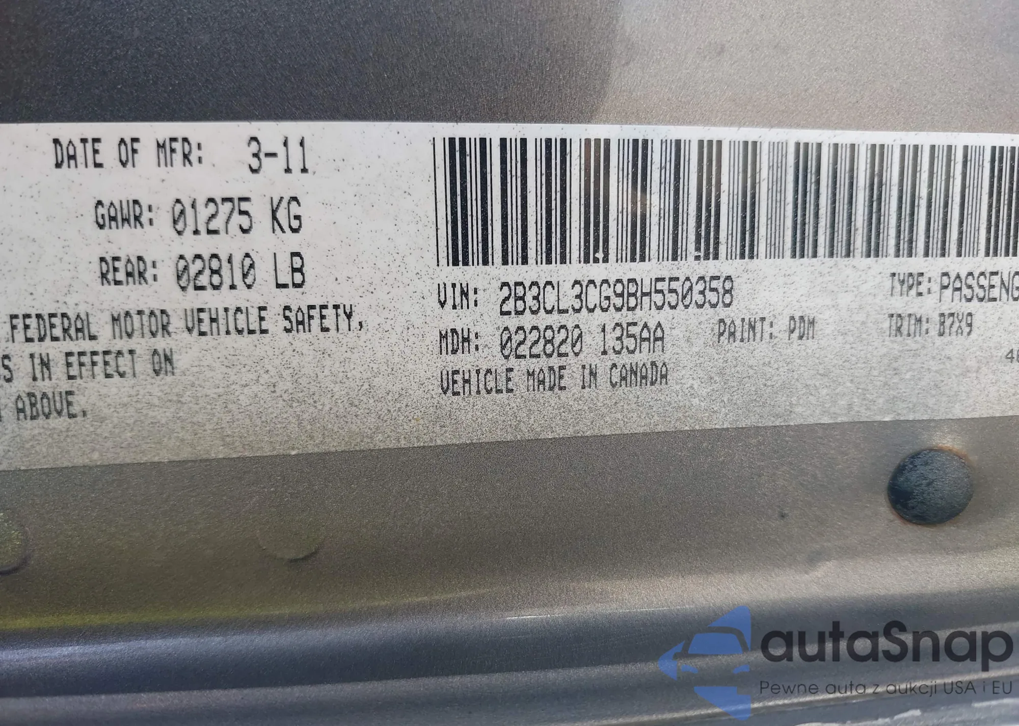 LOT: 42569819 VIN: 2B3CL3CG9BH550358