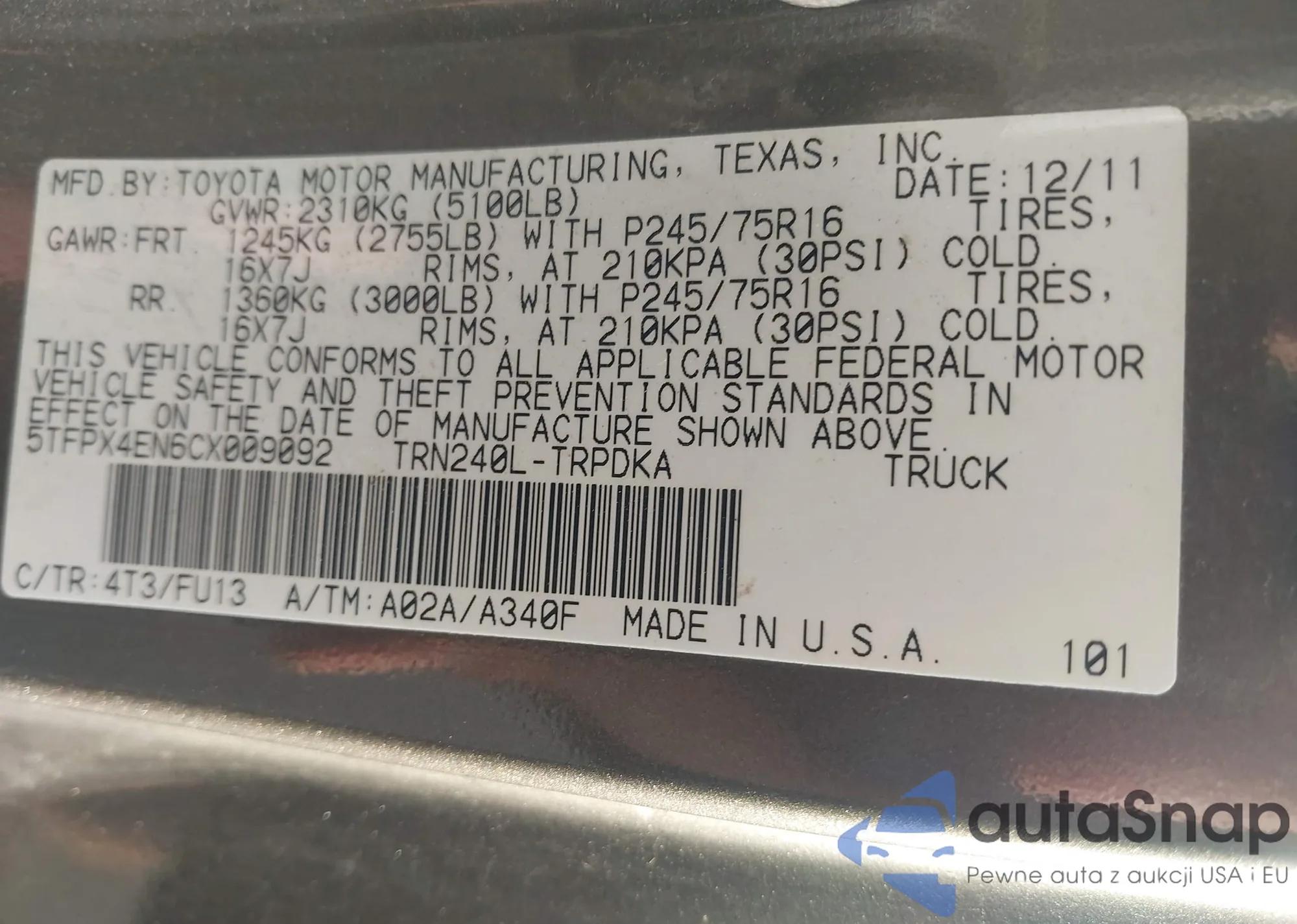• VIN 5TFPX4EN6CX009092
