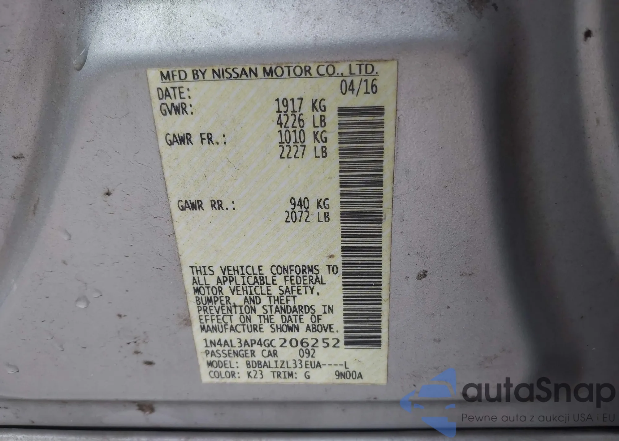 LOT: 43016044 VIN: 1N4AL3AP4GC206252