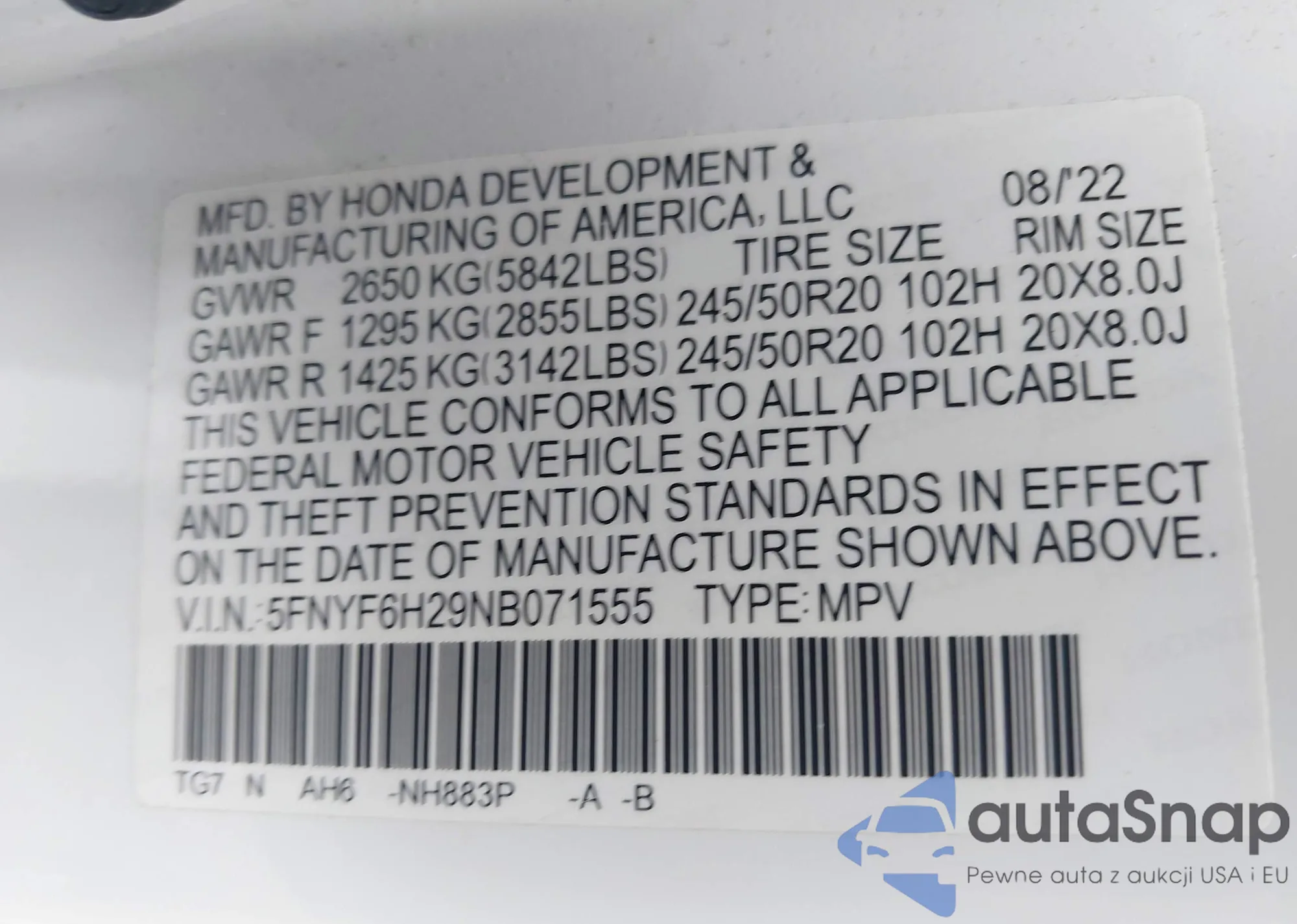 LOT: 42730253 VIN: 5FNYF6H29NB071555