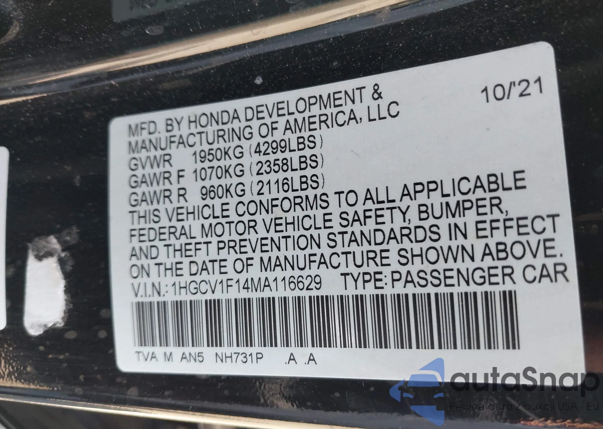 LOT: 42871644 VIN: 1HGCV1F31NA076349
