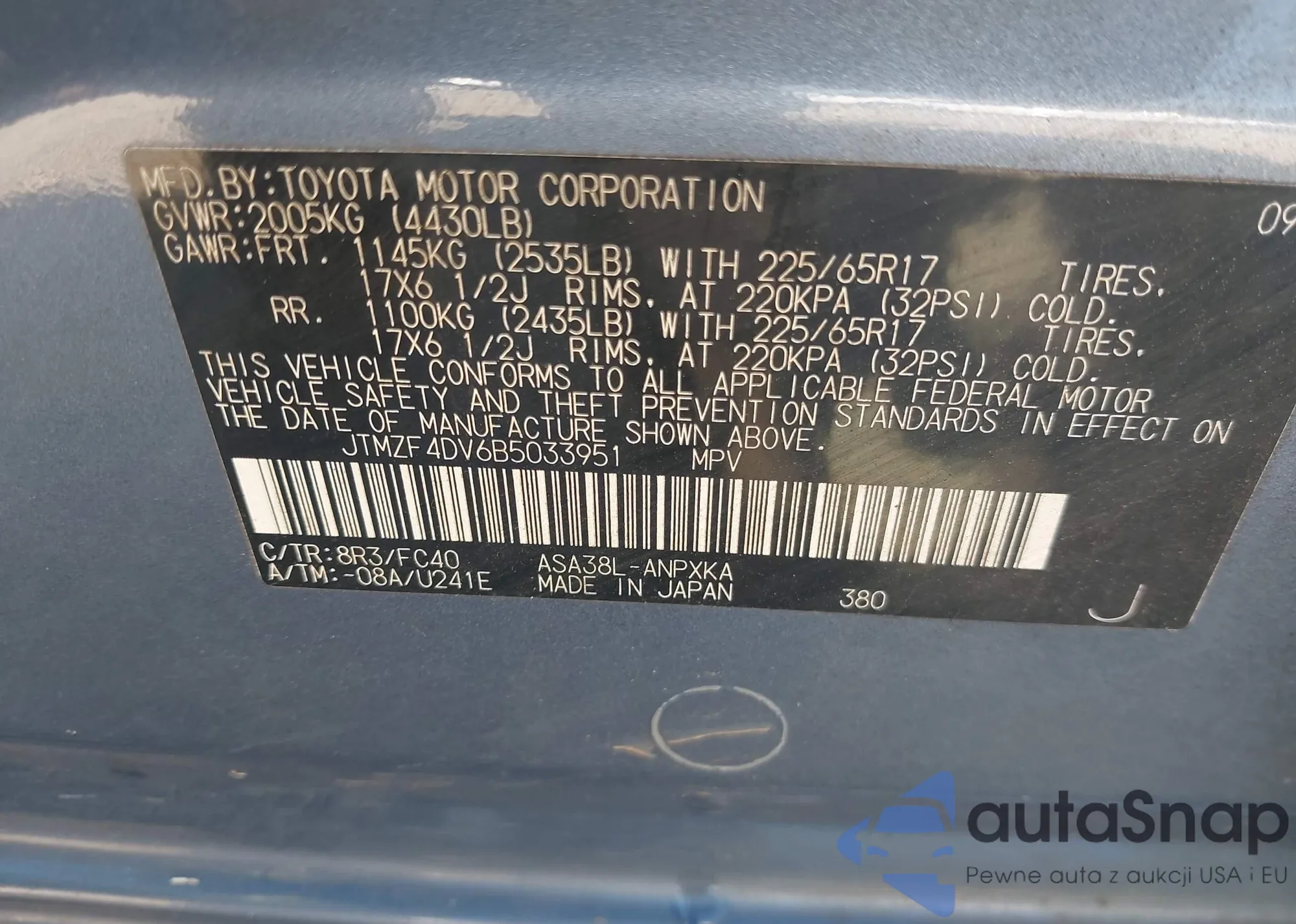 LOT: 43085353 VIN: JTMZF4DV6B5033951