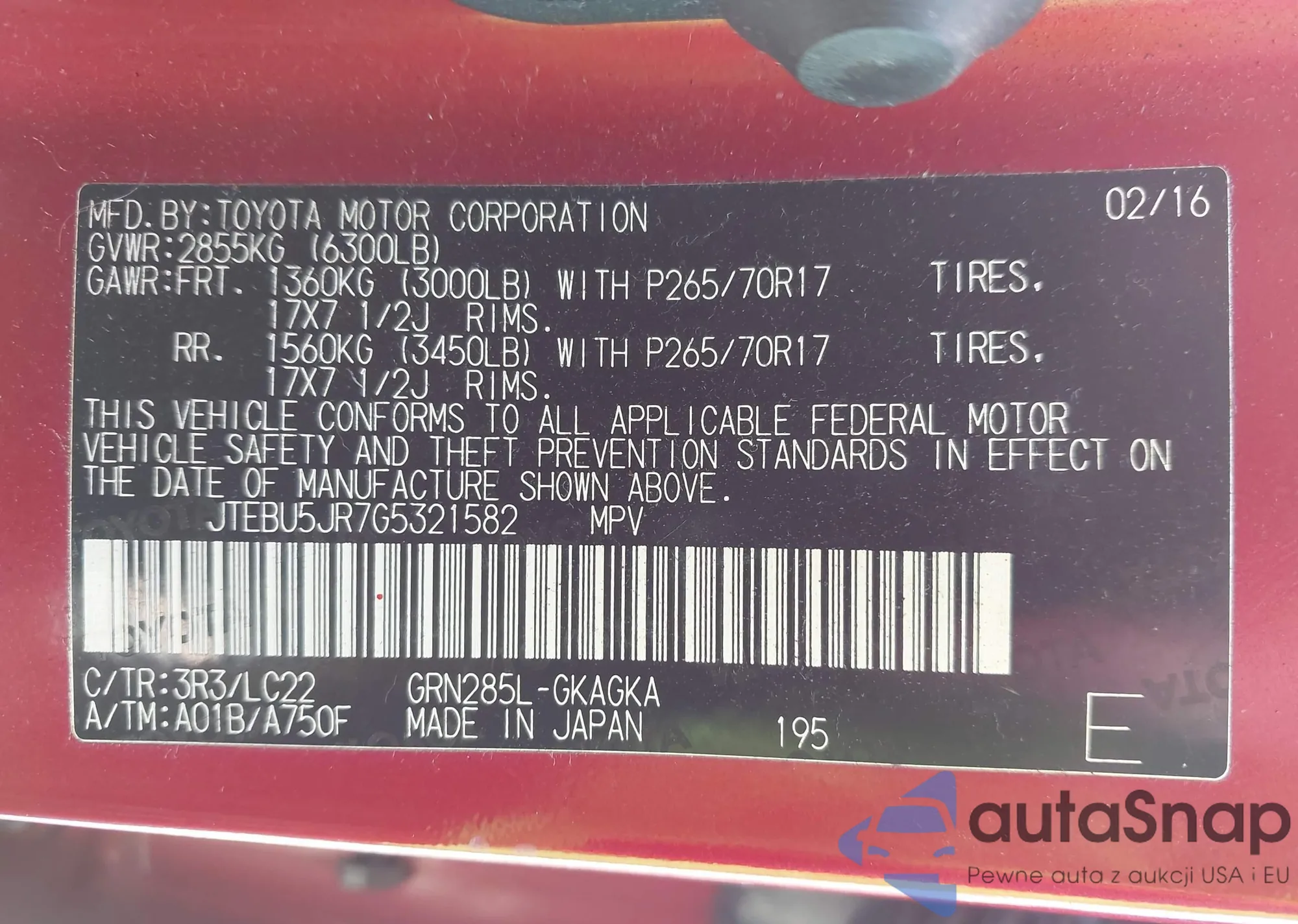 LOT: 42804120 VIN: JTEBU5JR7G5321582