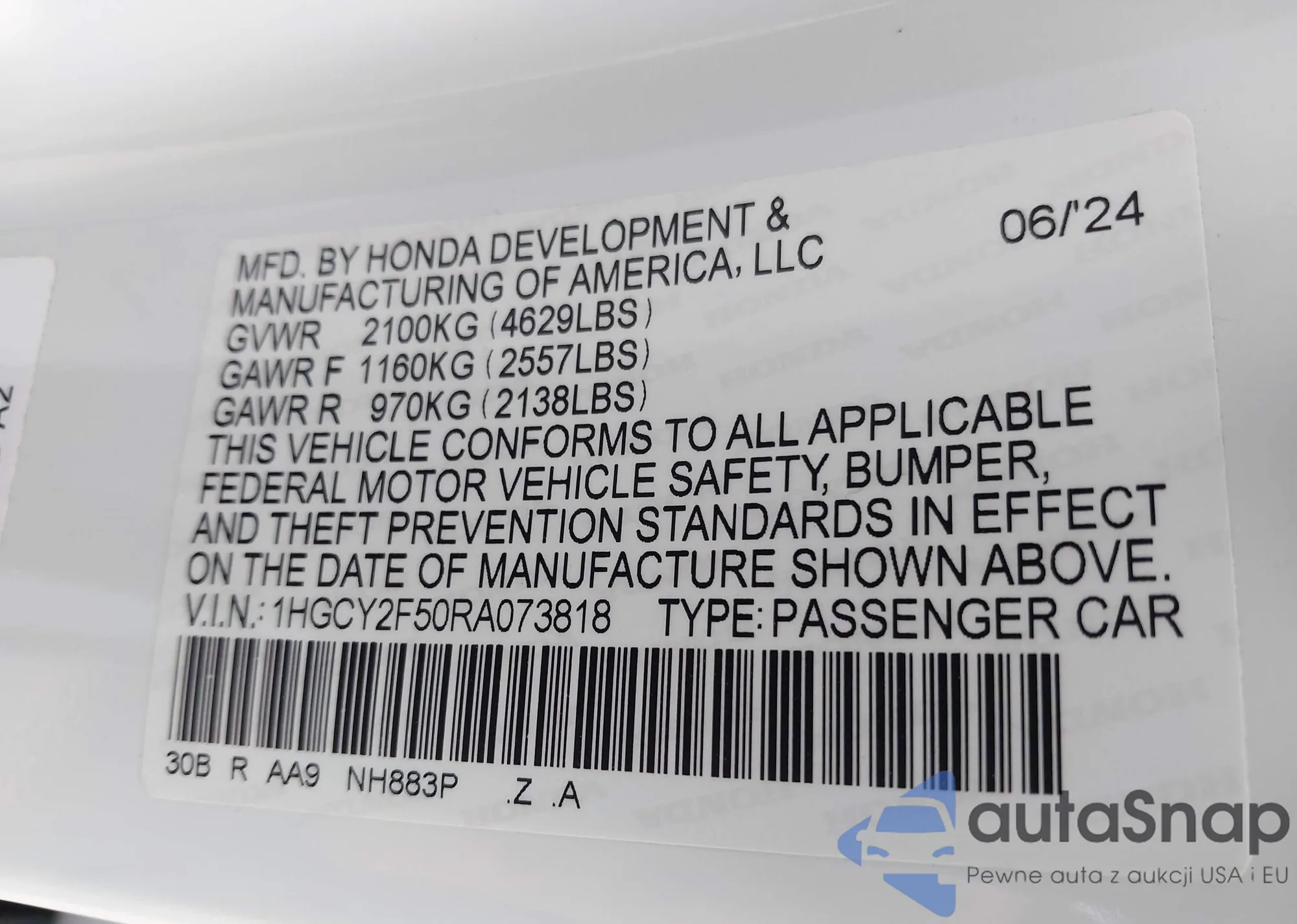 LOT: 42793272 VIN: 1HGCY1F35RA018421
