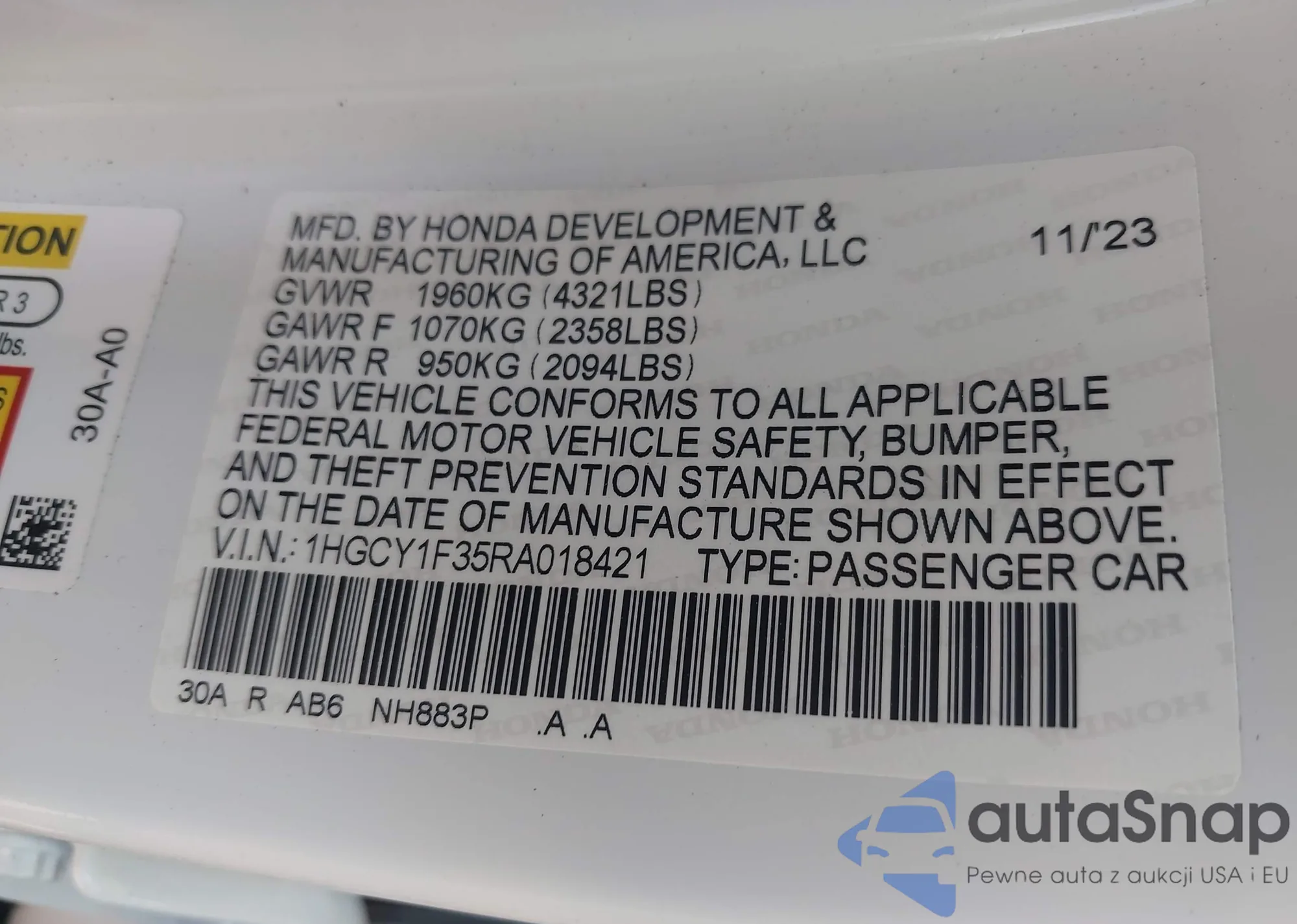 • VIN 1HGCY1F35RA018421