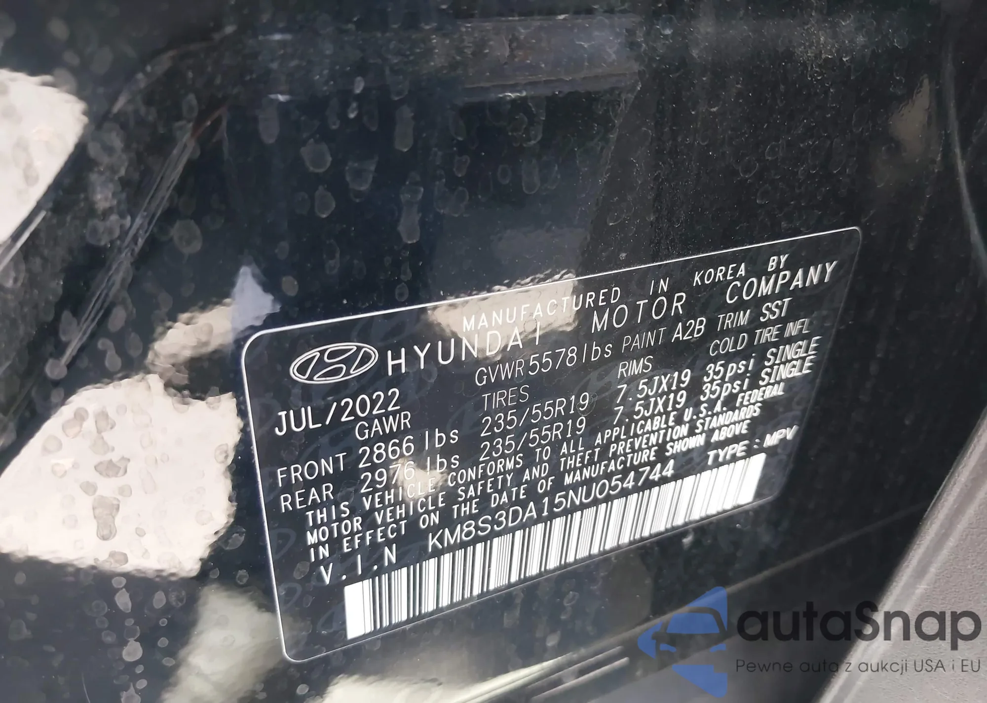 LOT: 43039577 VIN: KM8S3DA15NU054744