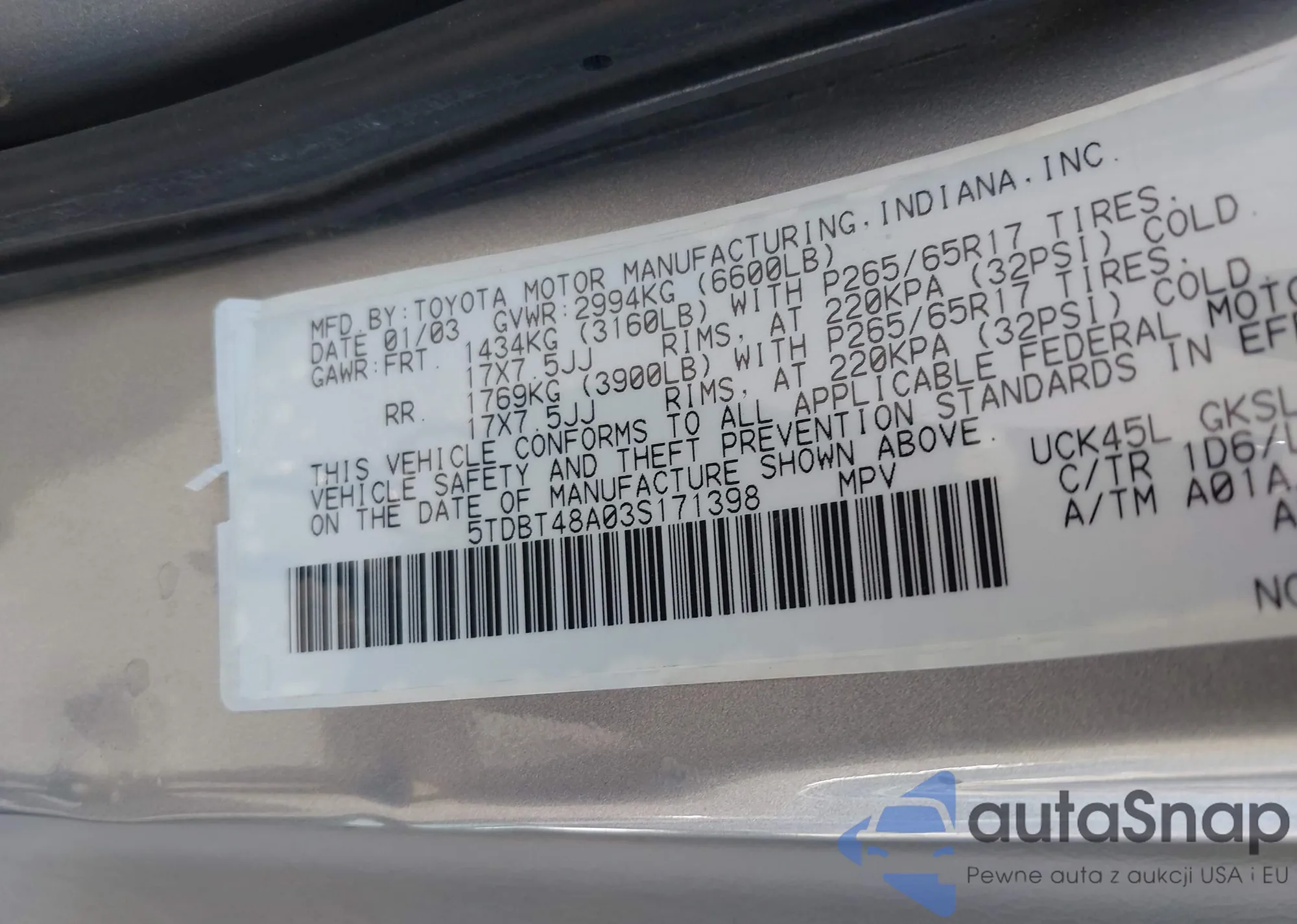 LOT: 43062867 VIN: 5TDBT48A03S171398