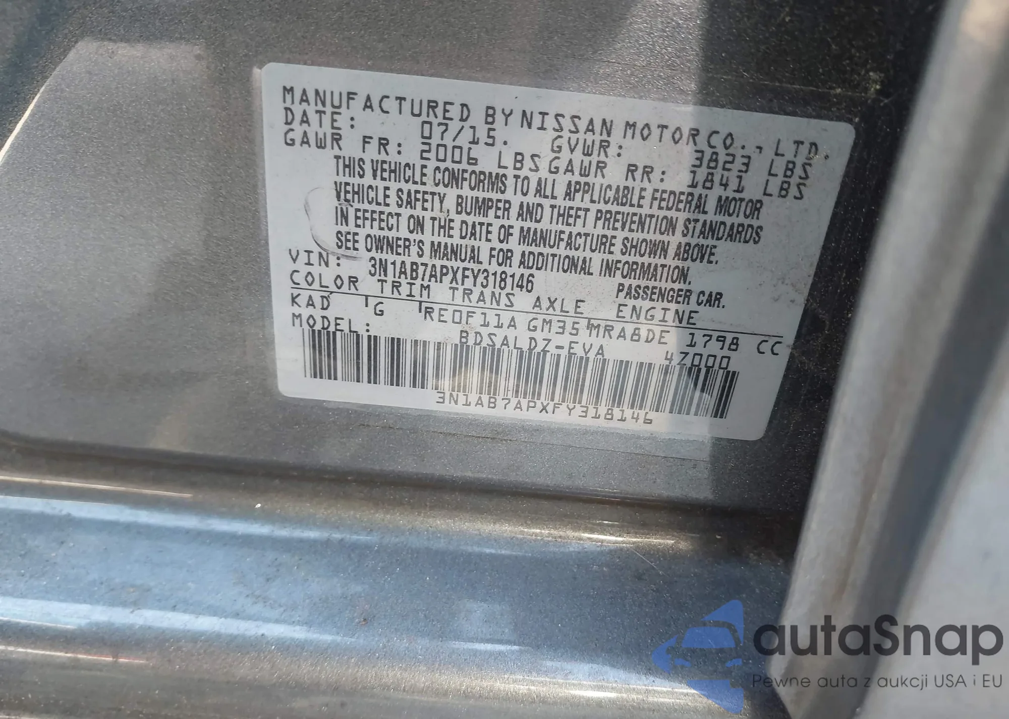 LOT: 43231004 VIN: 3N1AB7APXFY318146