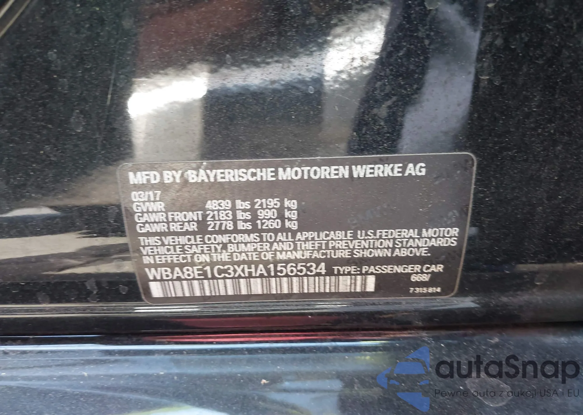 LOT: 43114359 VIN: WBA8E1C3XHA156534