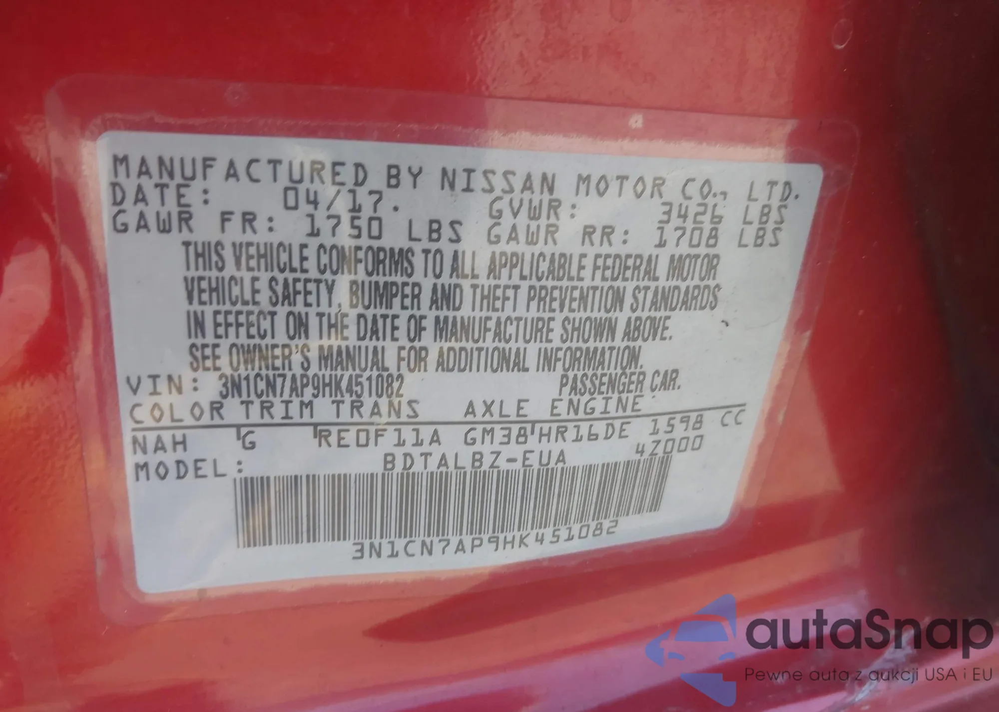 • VIN 3N1CN7AP9HK451082