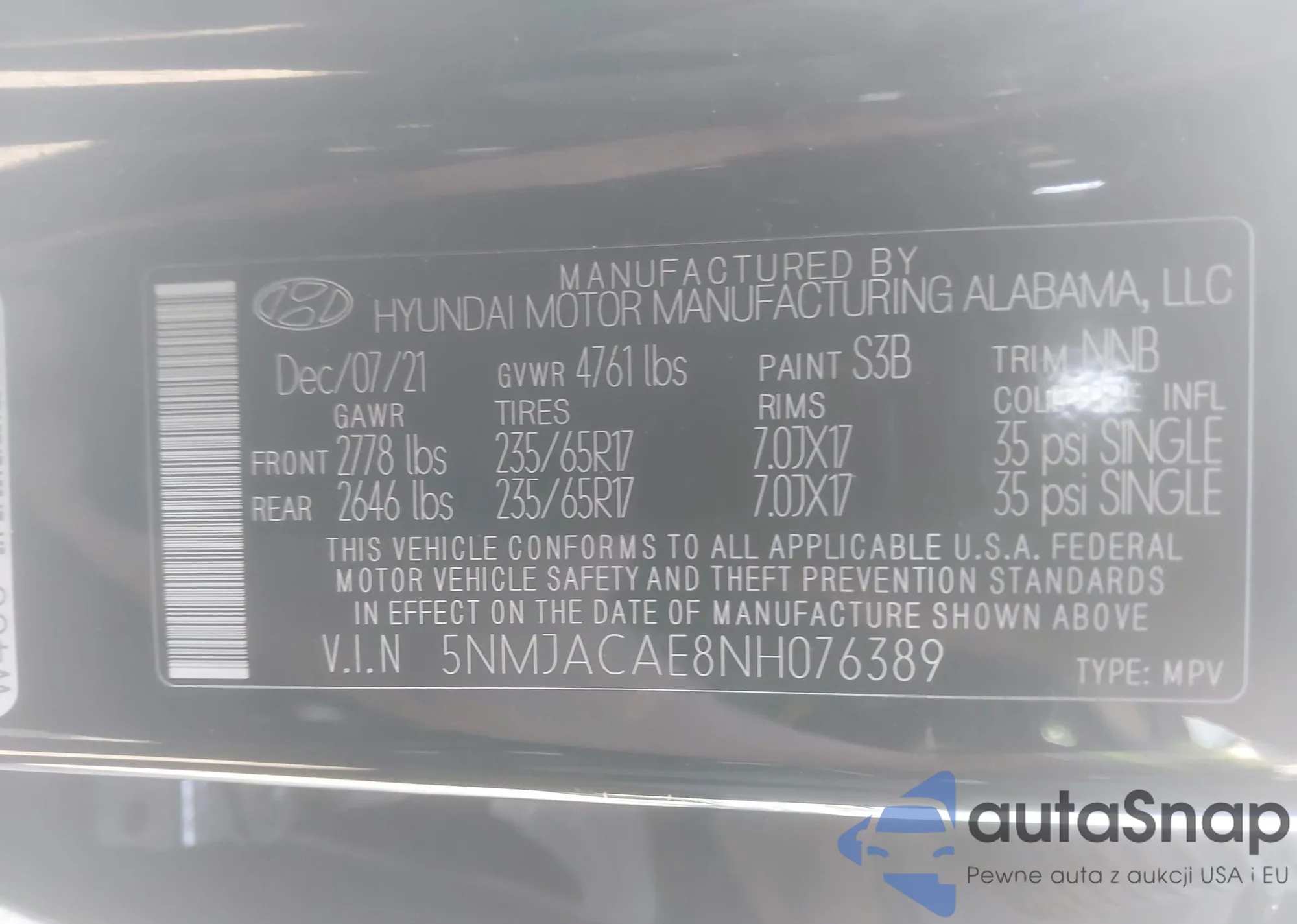 • VIN 5NMJACAE8NH076389