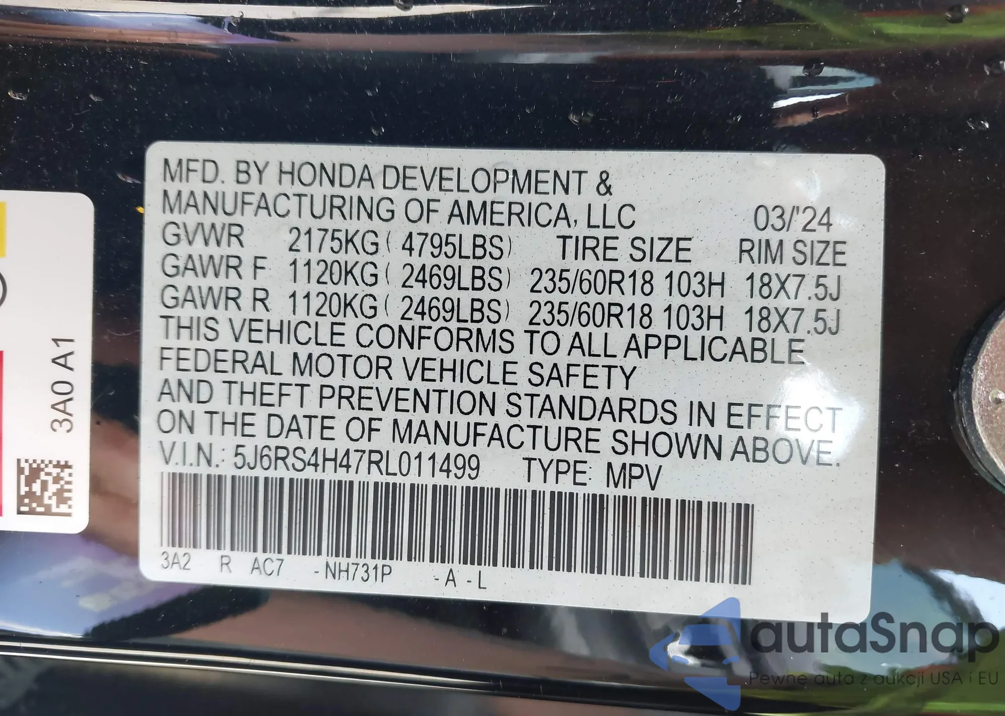 • VIN 5J6RS4H47RL011499