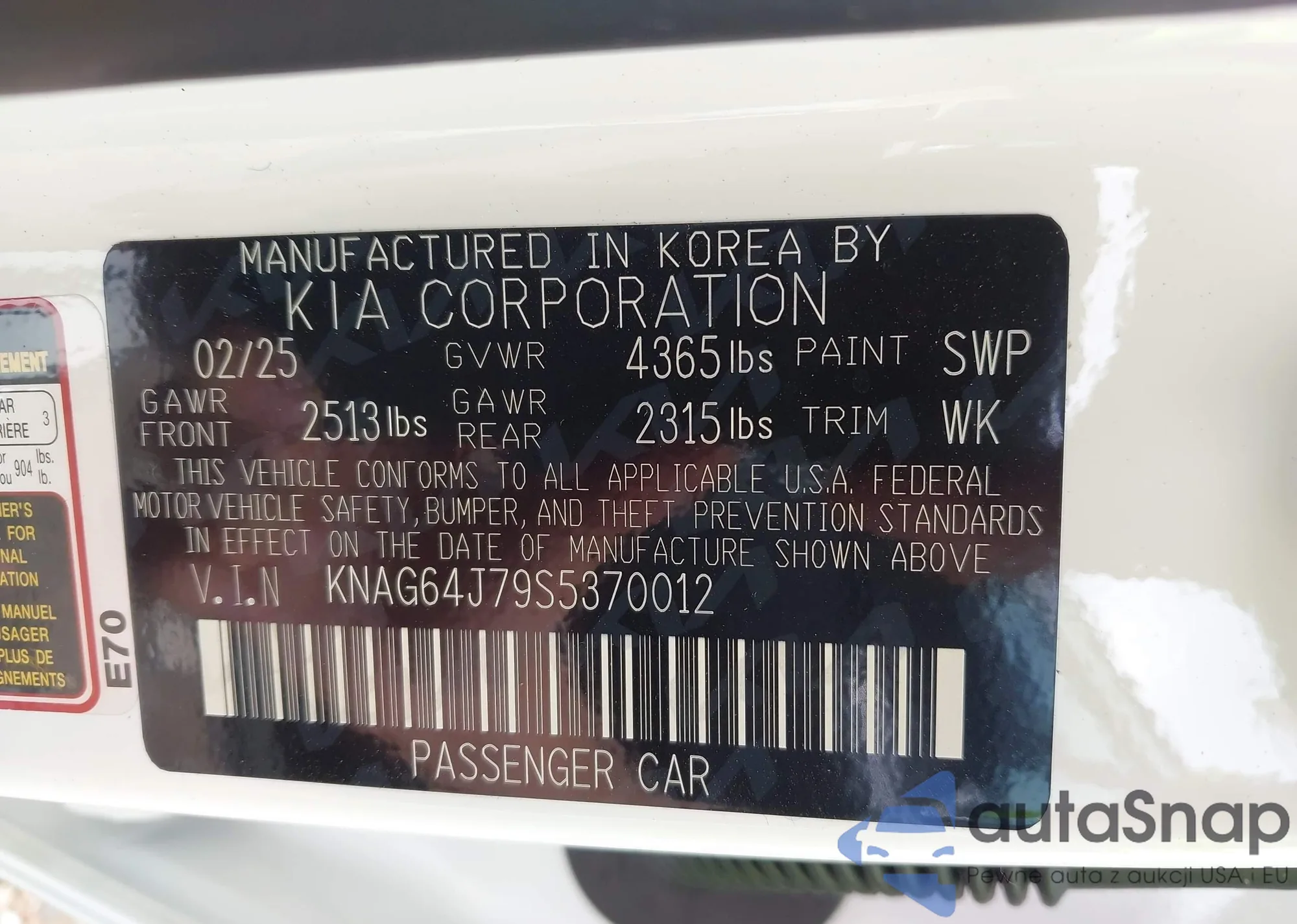 LOT: 42985223 VIN: KNAG64J79S5370012
