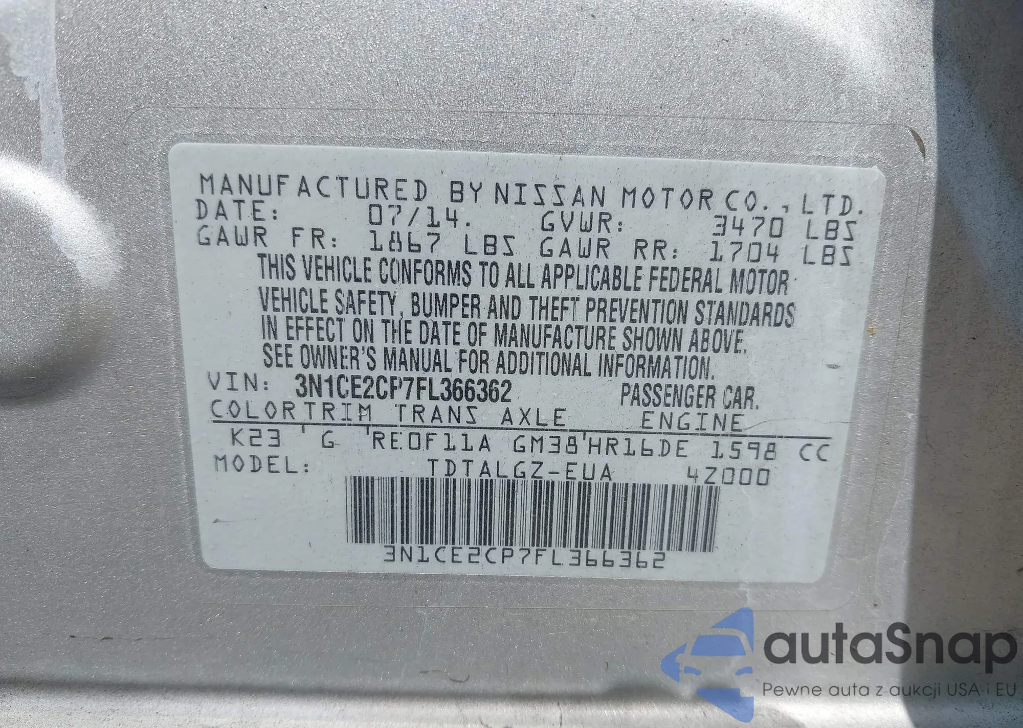 • VIN 3N1CE2CP7FL366362