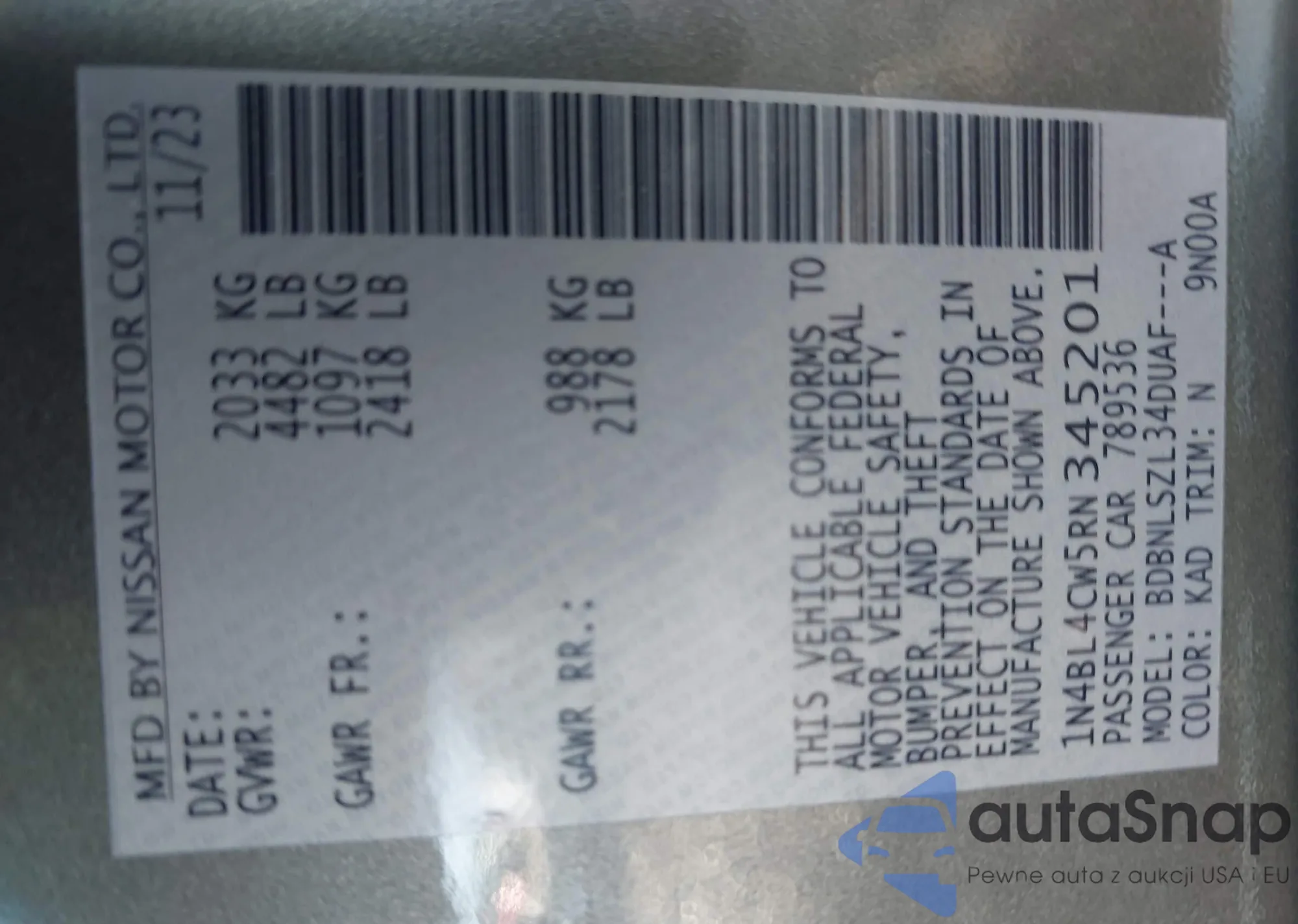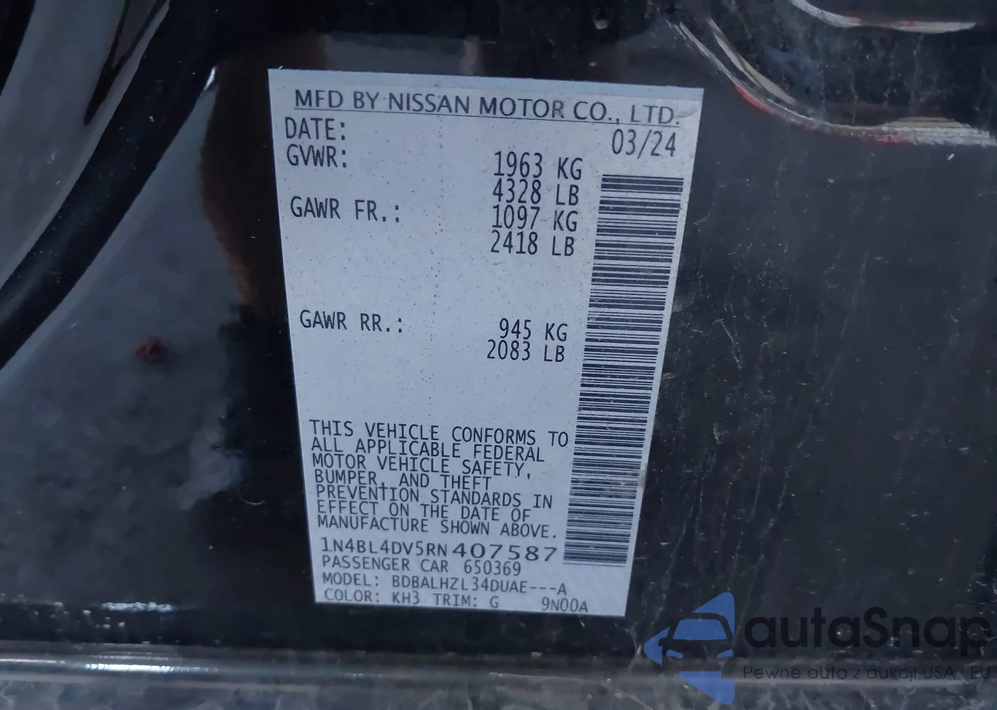 LOT: 43123373 VIN: 1N4BL4DV5RN407587