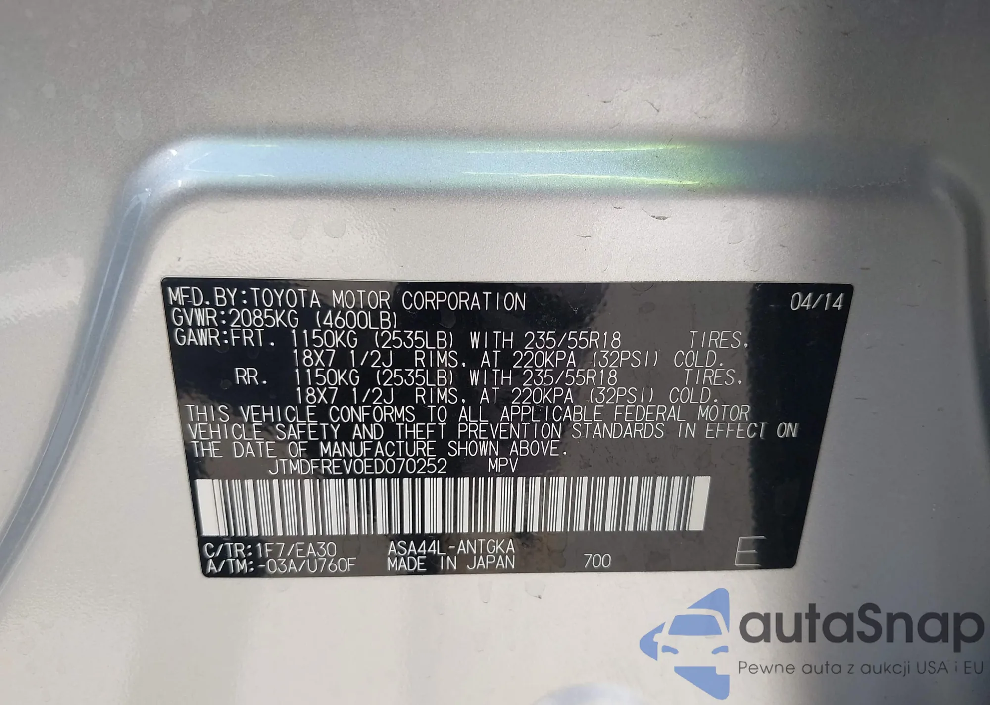 • VIN JTMDFREV0ED070252