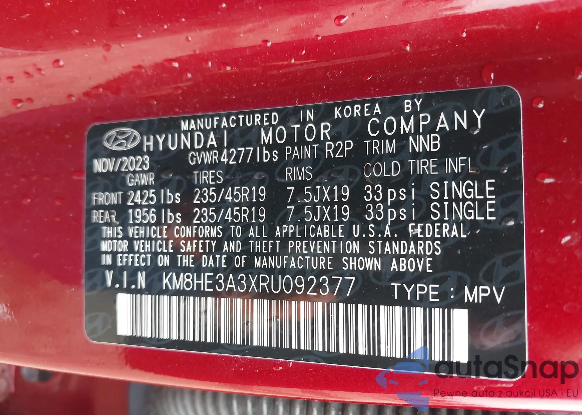 LOT: 43177185 VIN: KM8HE3A3XRU092377