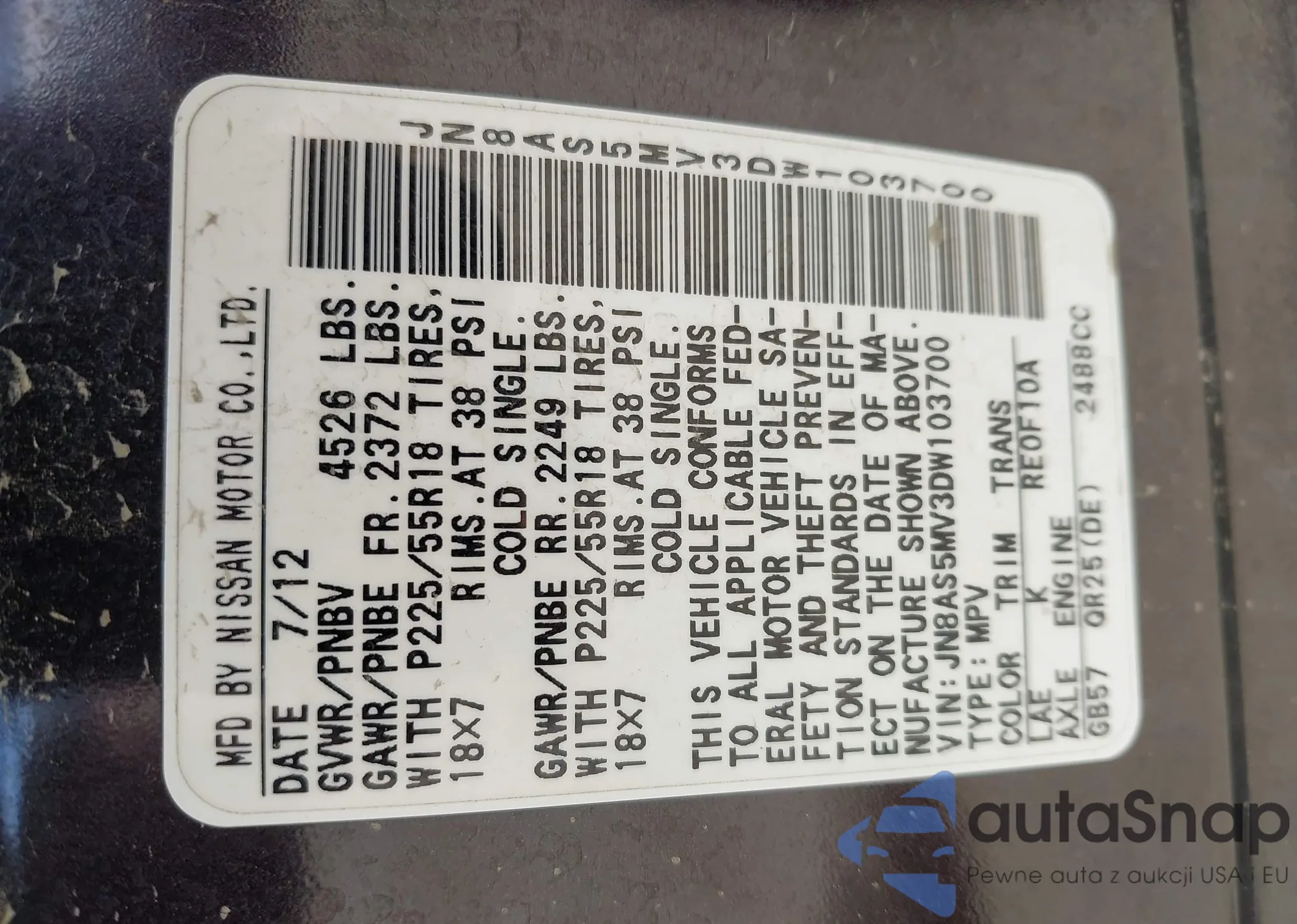 • VIN JN8AS5MV3DW103700
