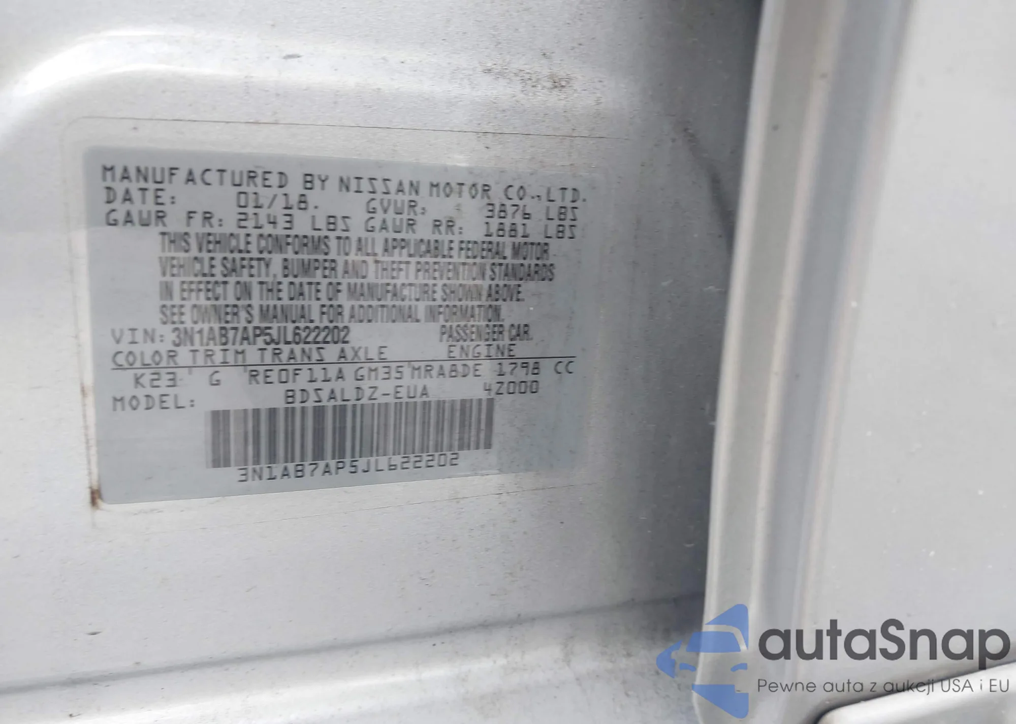 LOT: 43105942 VIN: 3N1AB7AP5JL622202