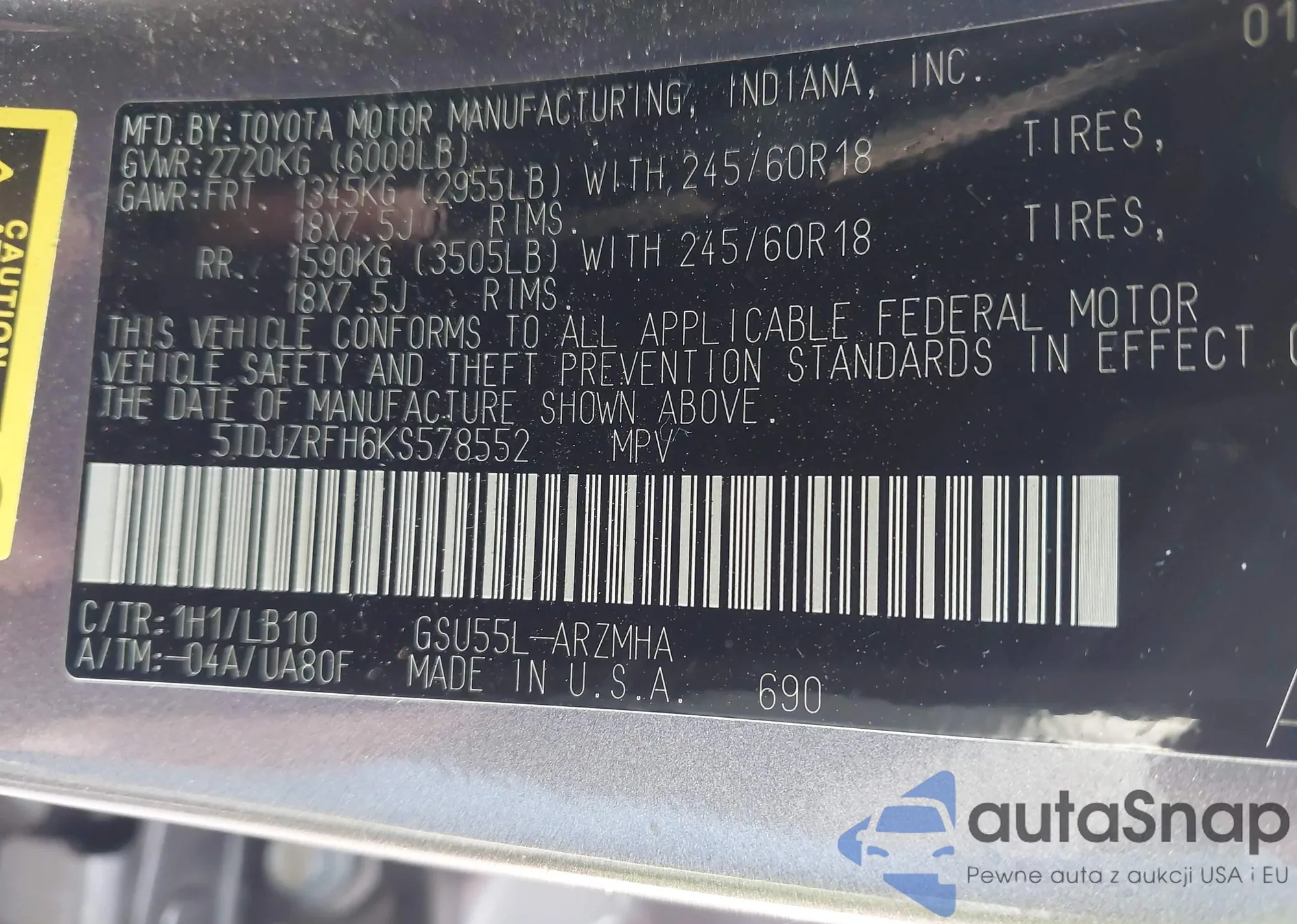 LOT: 43075235 VIN: 5TDJZRFH6KS578552