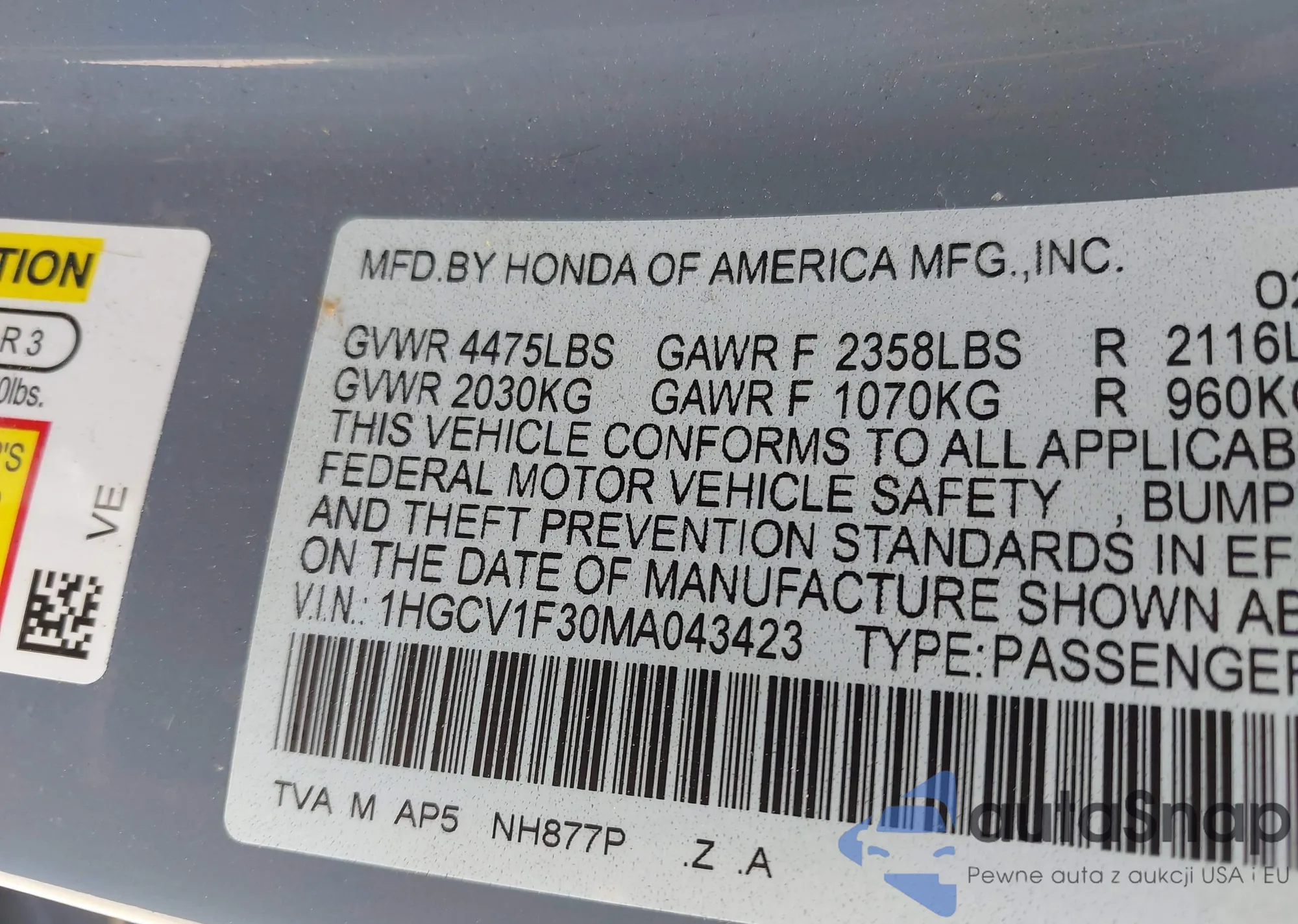 • VIN 1HGCV1F30MA043423