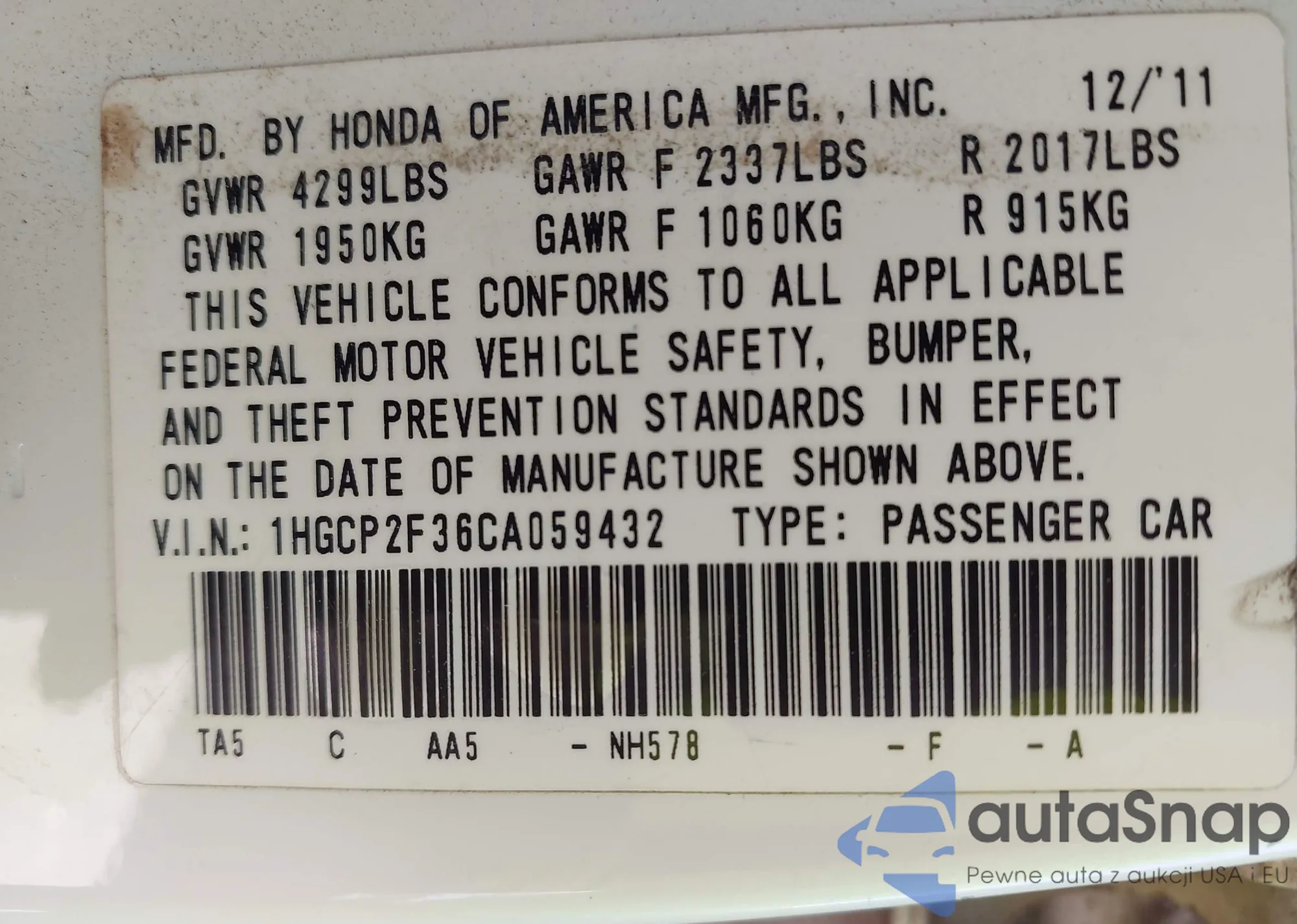 LOT: 43107216 VIN: 1HGCP2F36CA059432