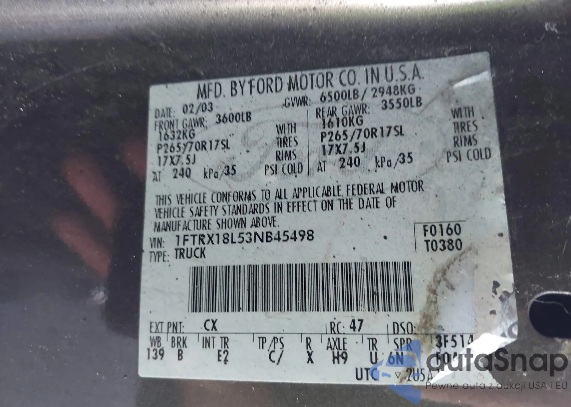 LOT: 43108867 VIN: 1FTRX18L53NB45498