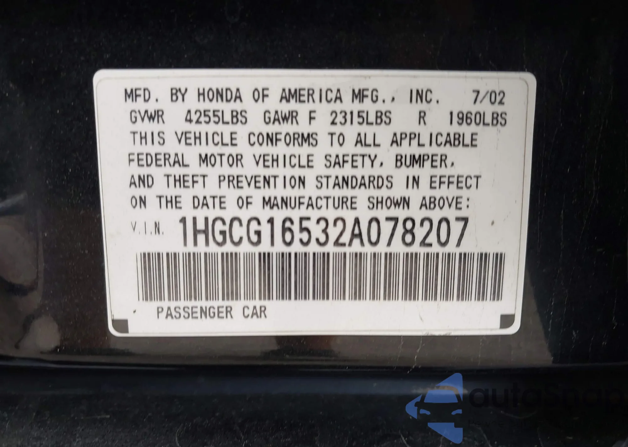 LOT: 43162835 VIN: 1HGCG16532A078207