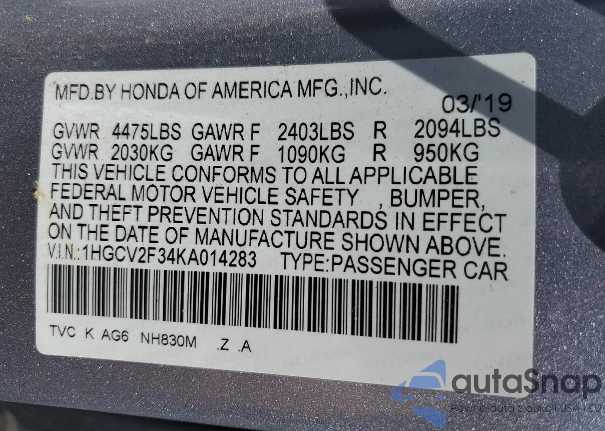 LOT: 71777325 VIN: 1HGCV2F34KA014283