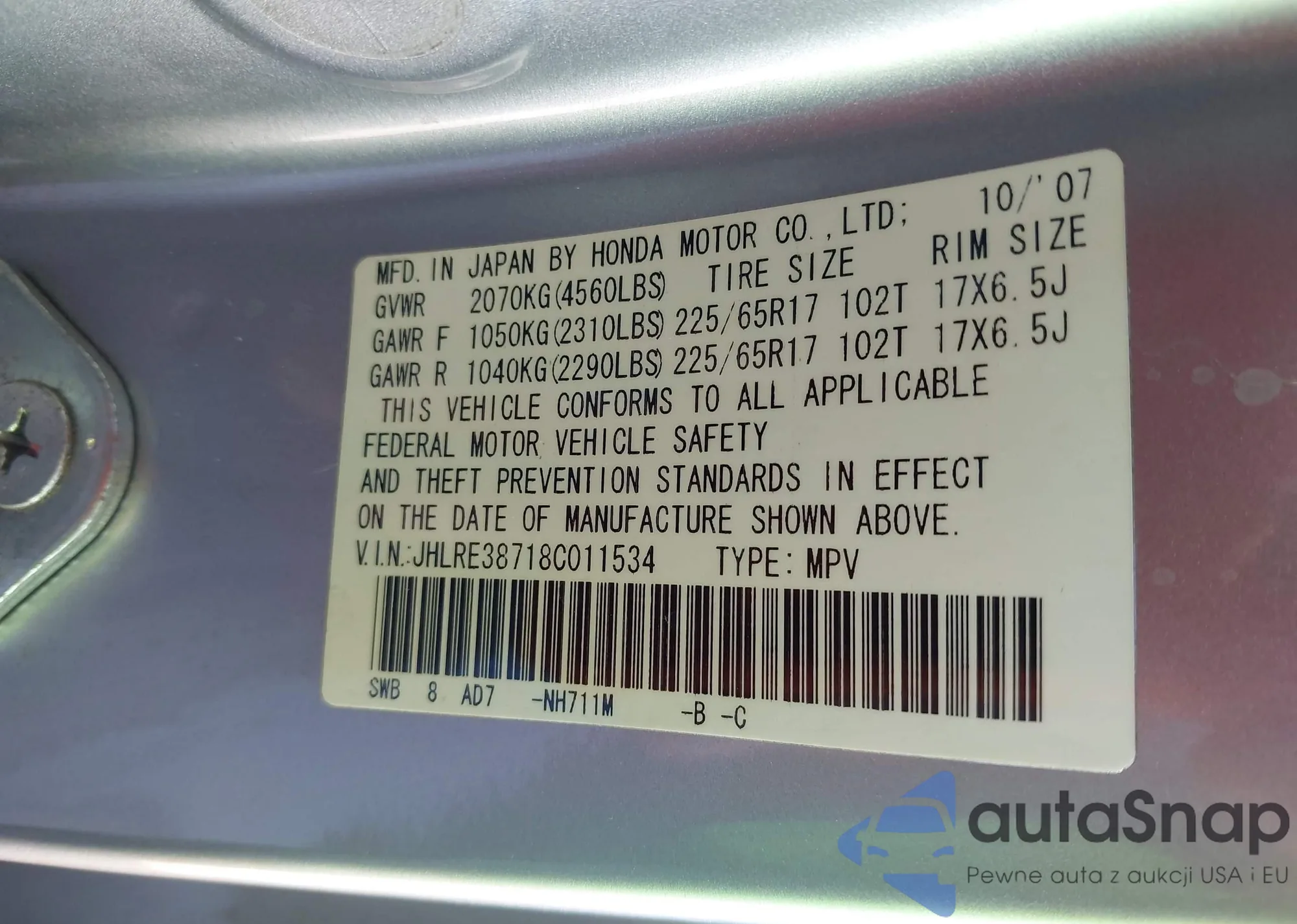• VIN JHLRE38718C011534
