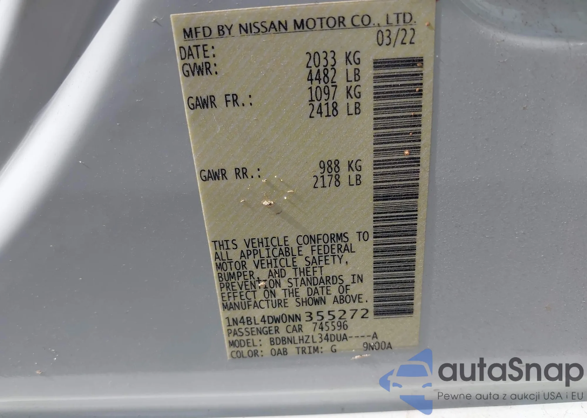 LOT: 42623306 VIN: 1N4BL4DW0NN355272