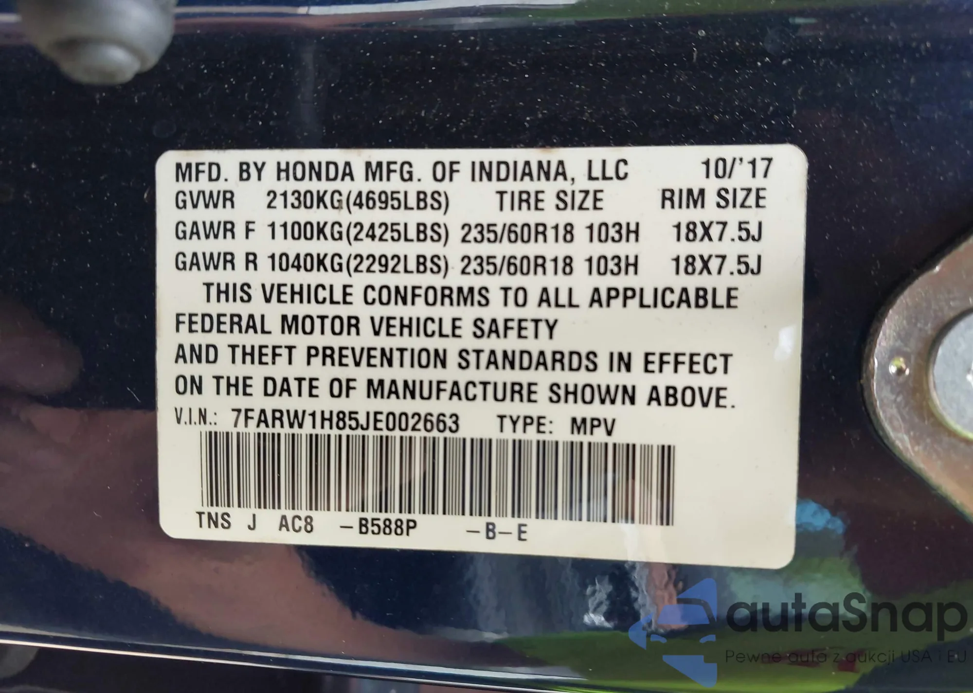 • VIN 1HGCV1F3XMA066854