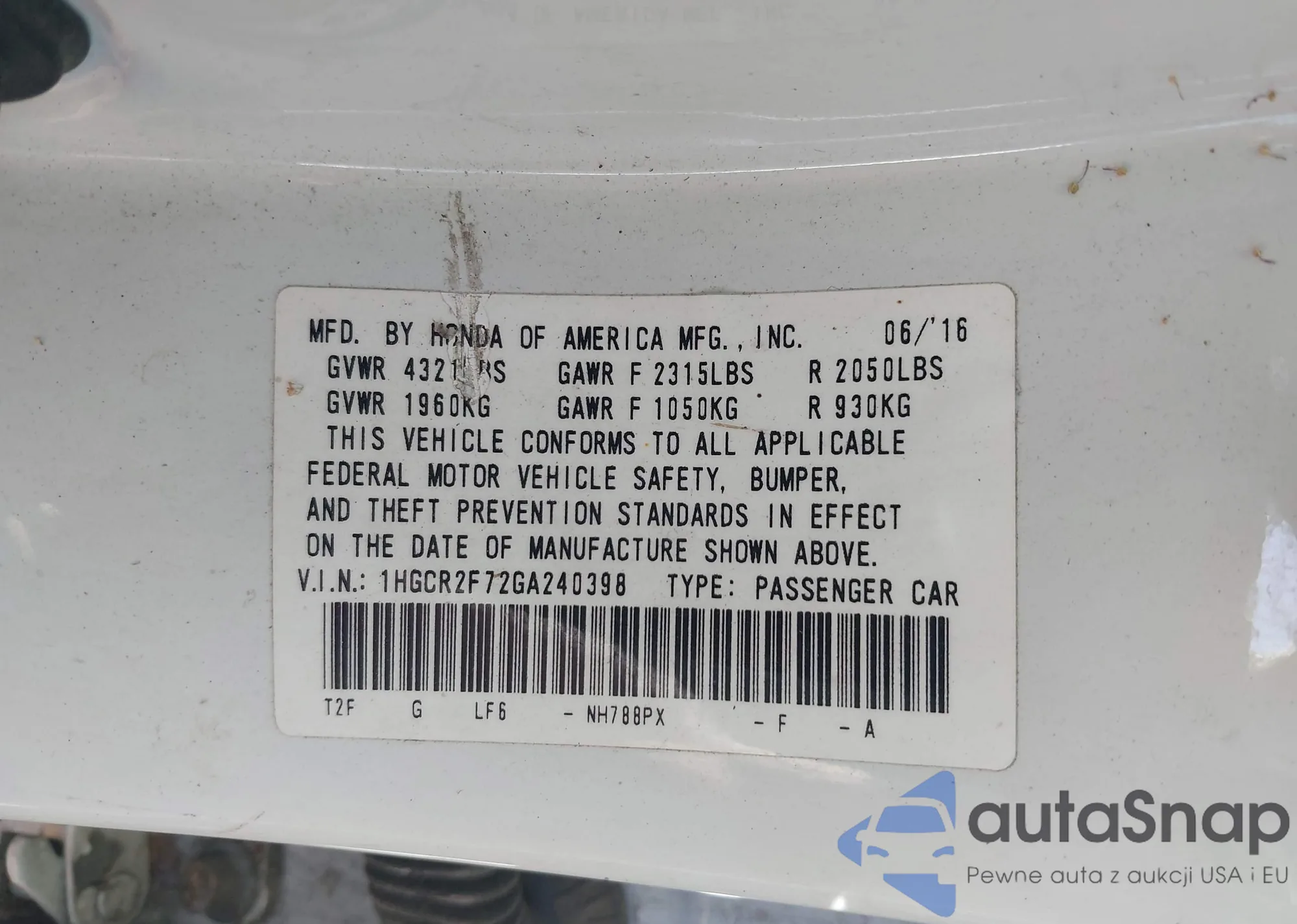 • VIN 1HGCR2F72GA240398