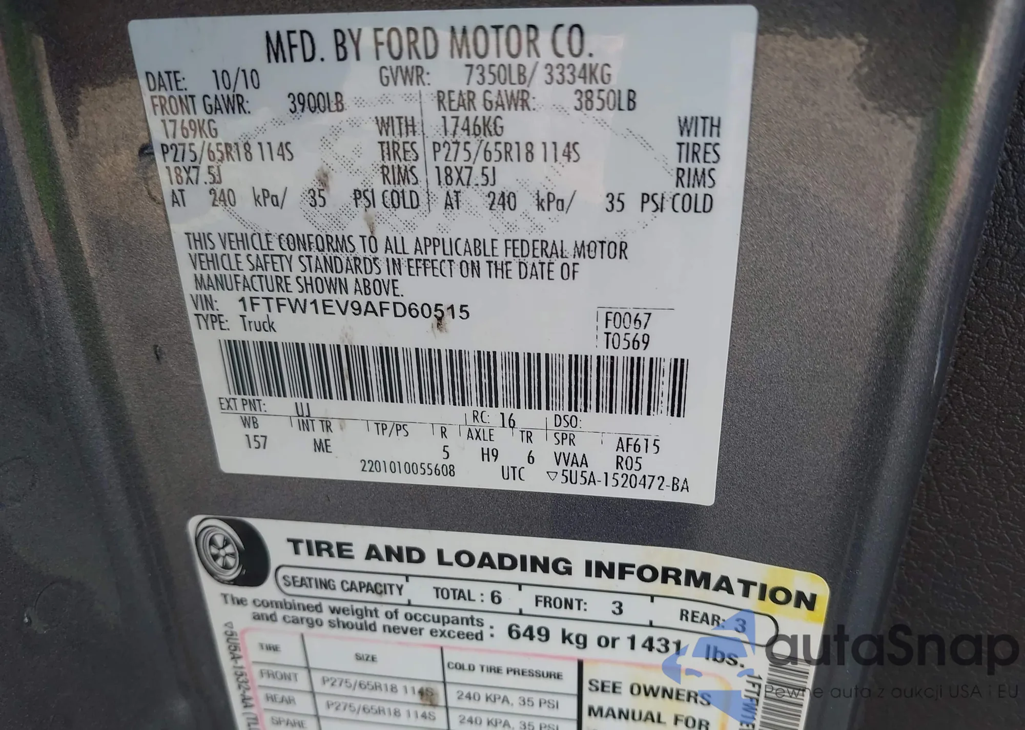 • VIN 1FTFW1EV9AFD60515