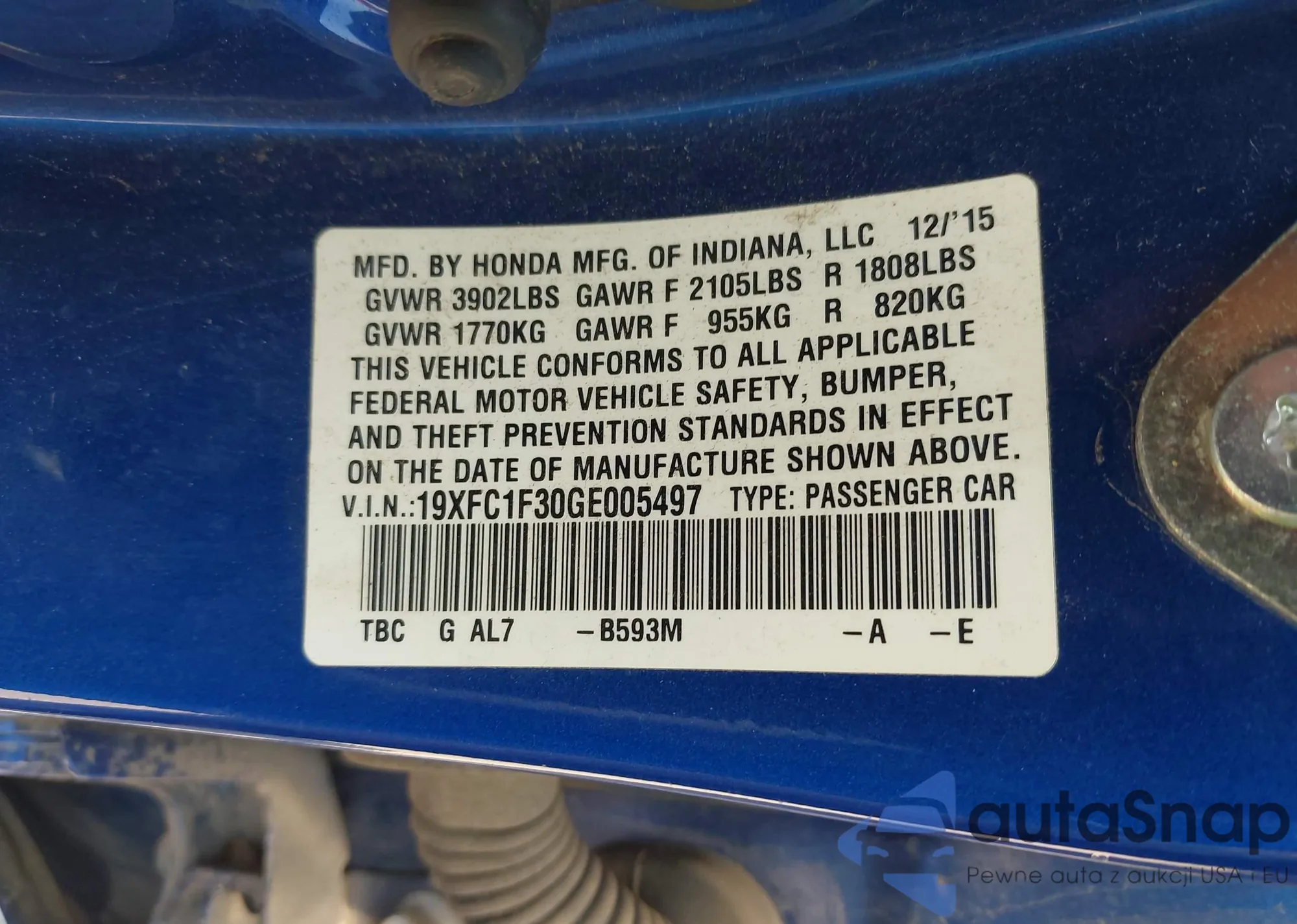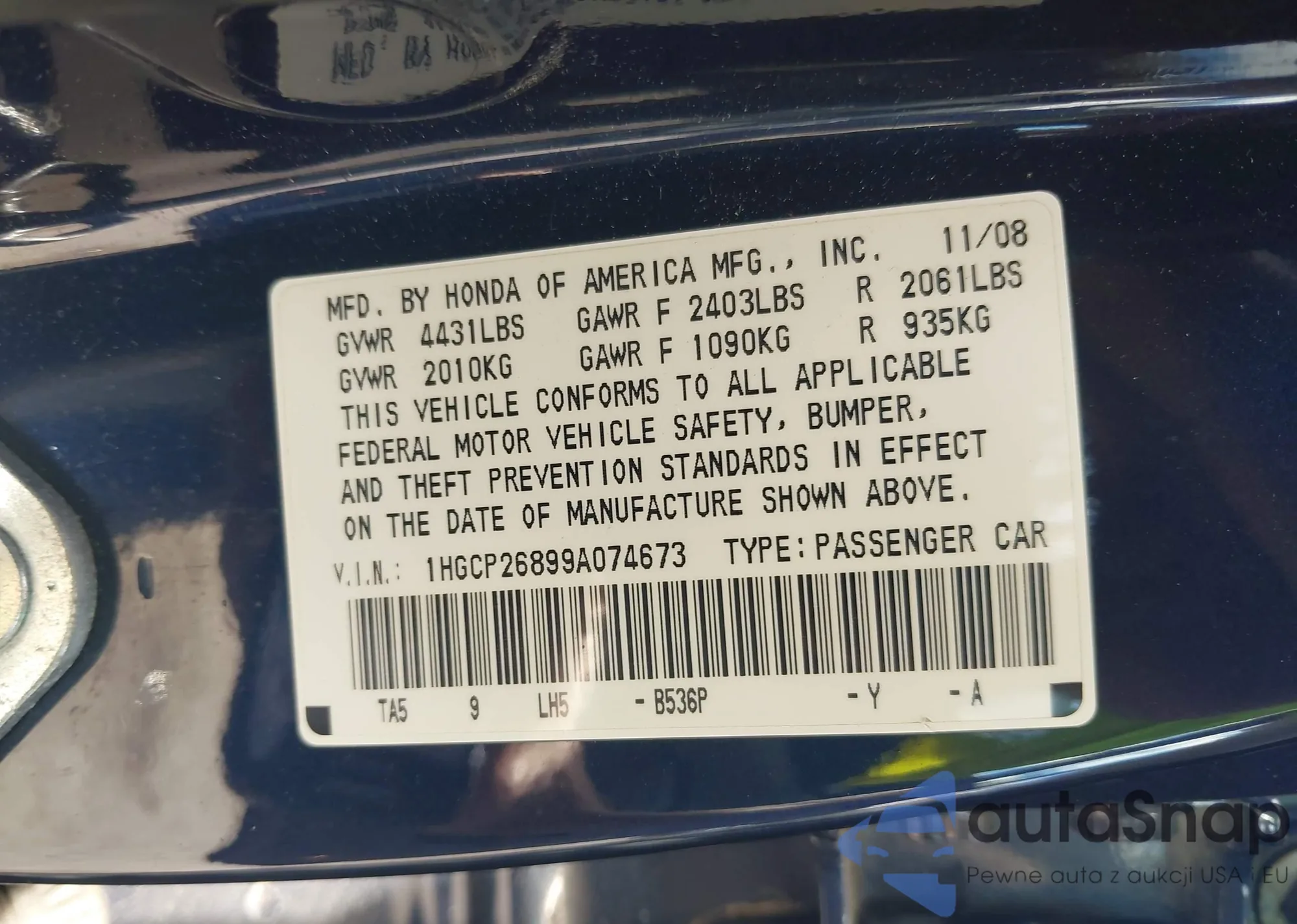 LOT: 43152053 VIN: 1HGCP26899A074673