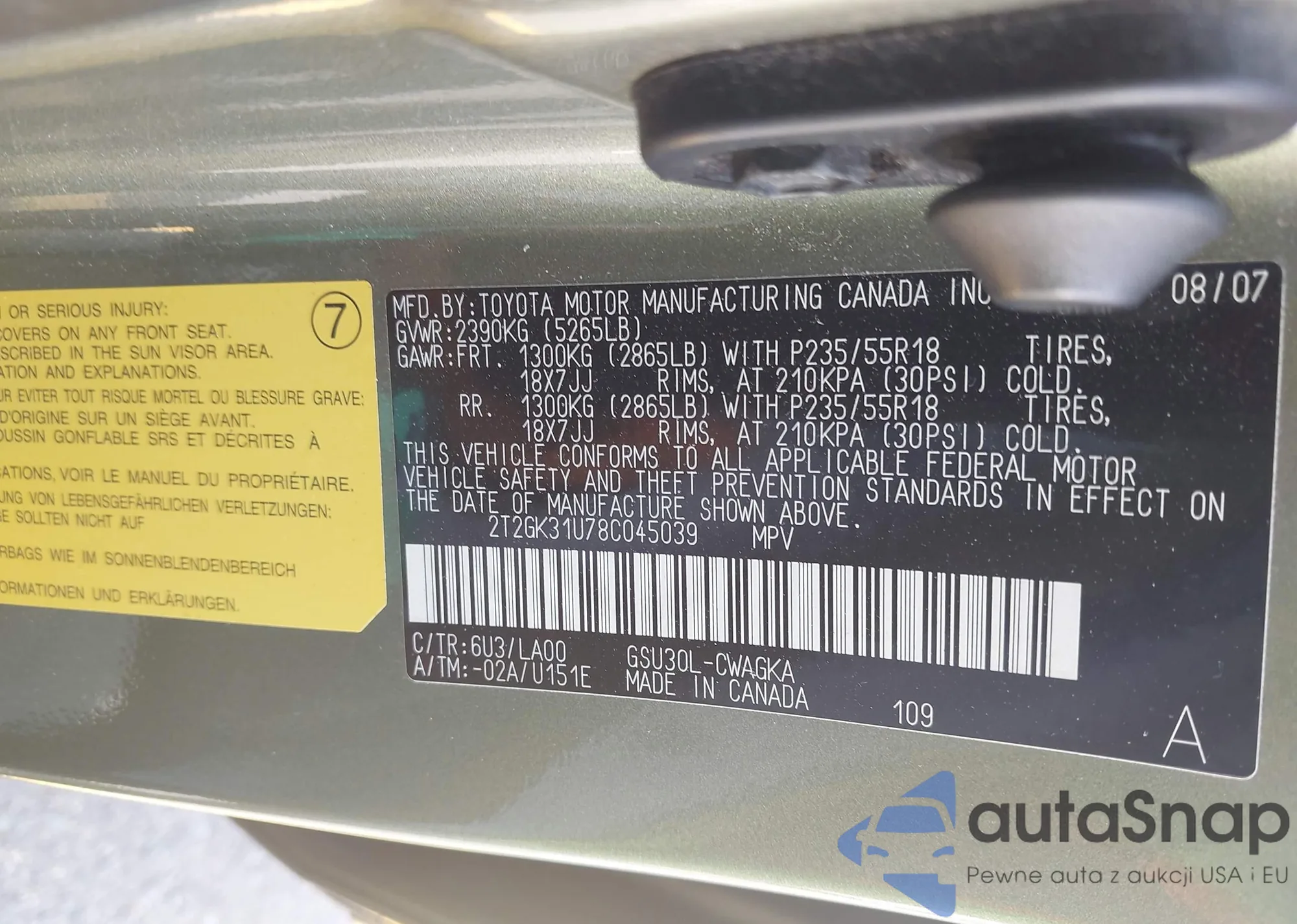 • VIN 2T2GK31U78C045039