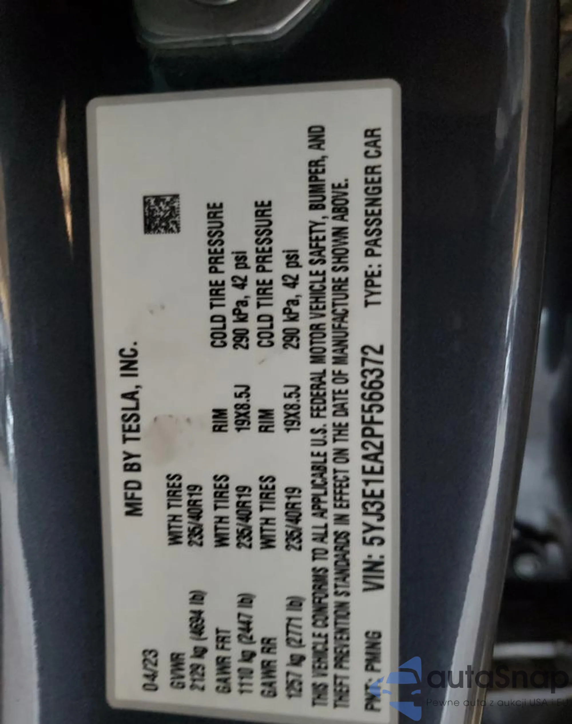 • VIN 5YJ3E1EA2PF566372
