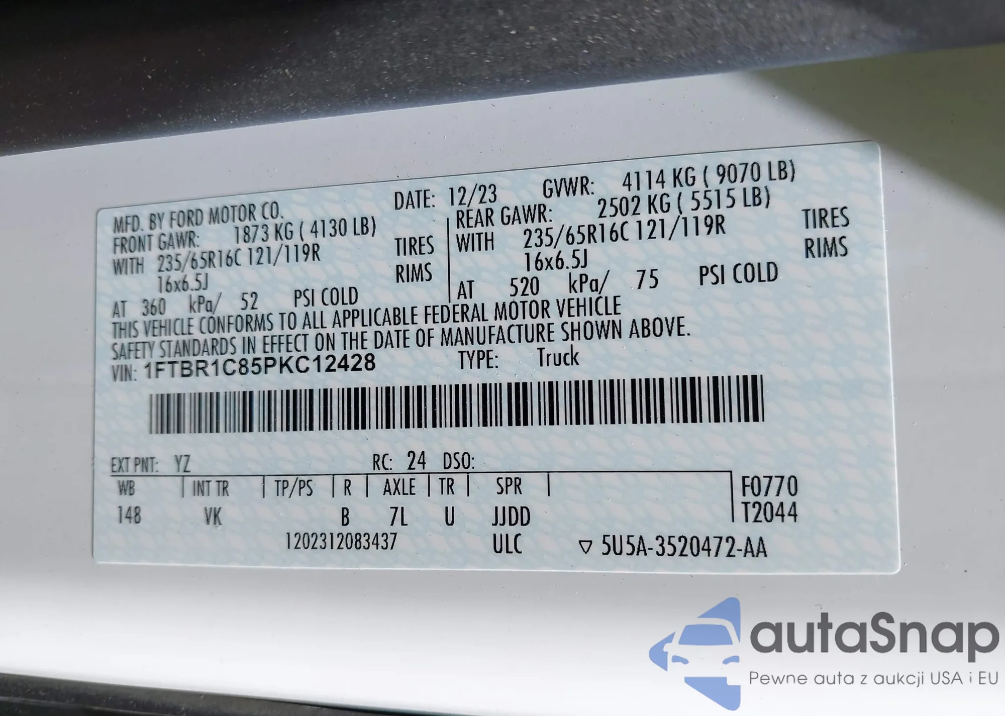 LOT: 42940713 VIN: 1FTBR1C85PKC12428