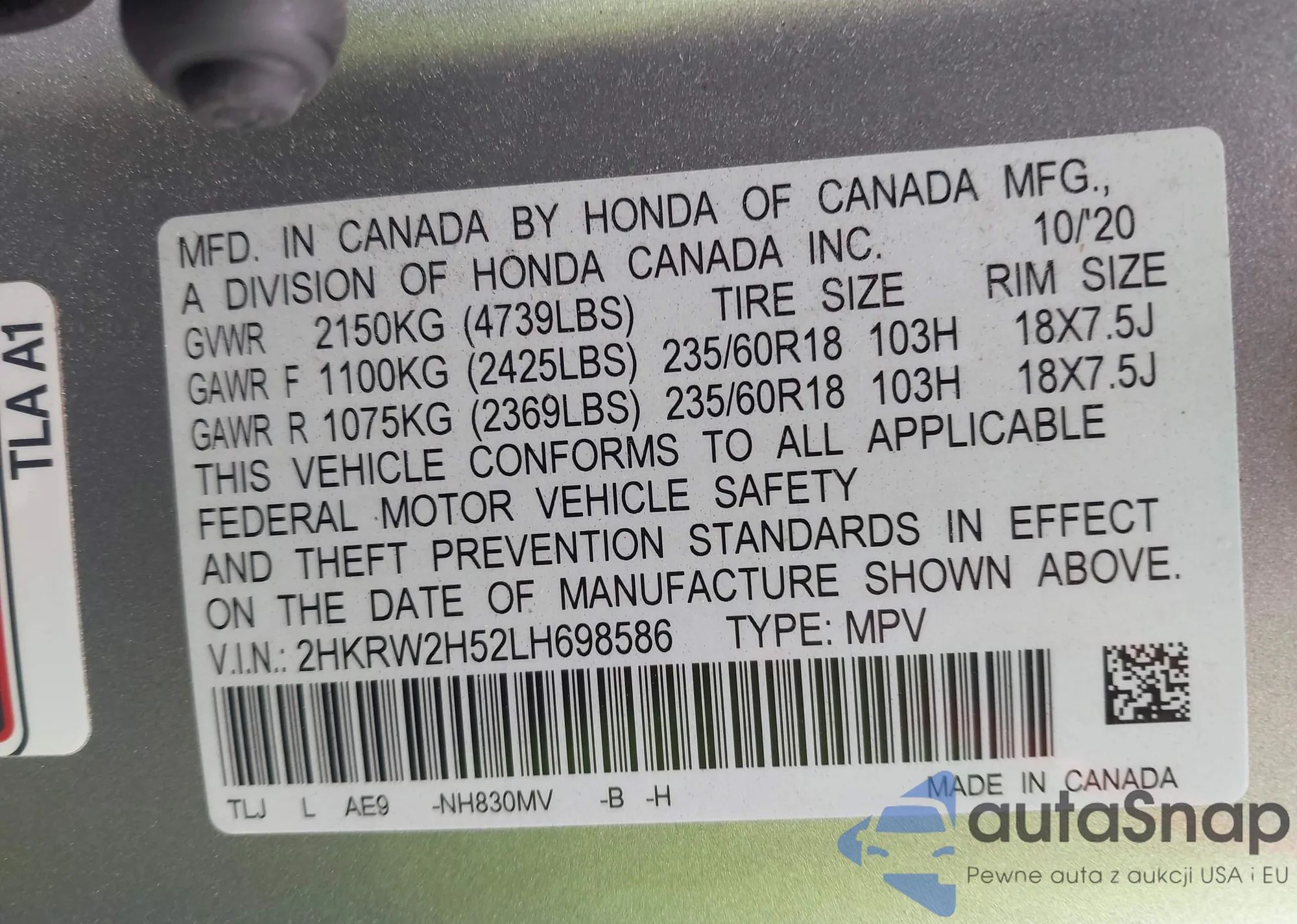 • VIN 2HKRW2H52LH698586