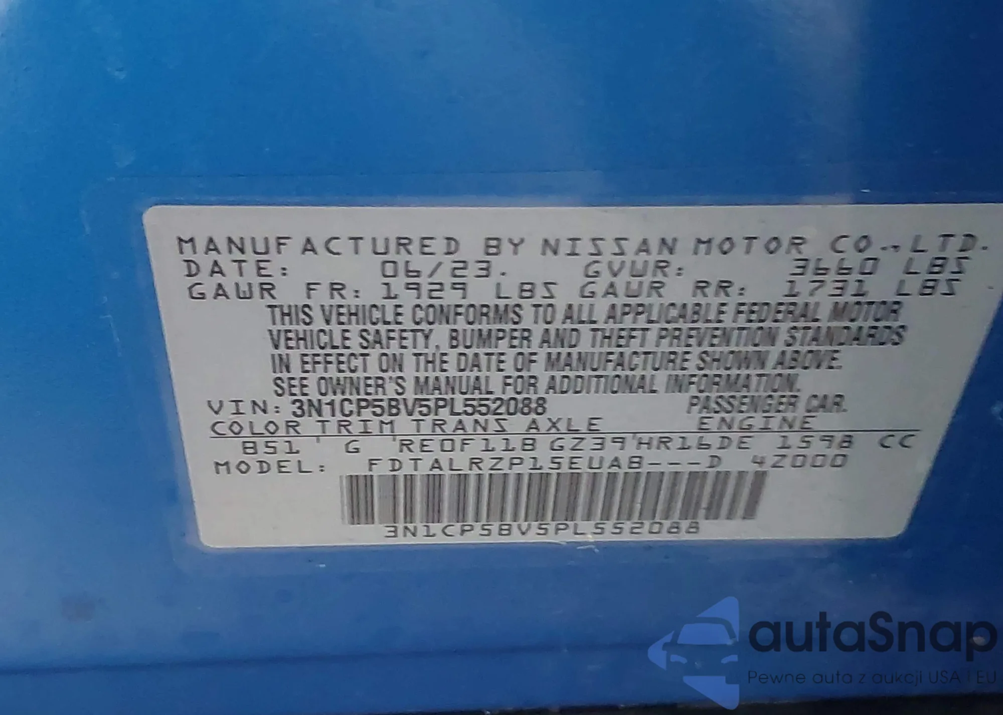 LOT: 42266607 VIN: 3N1CP5BV5PL552088