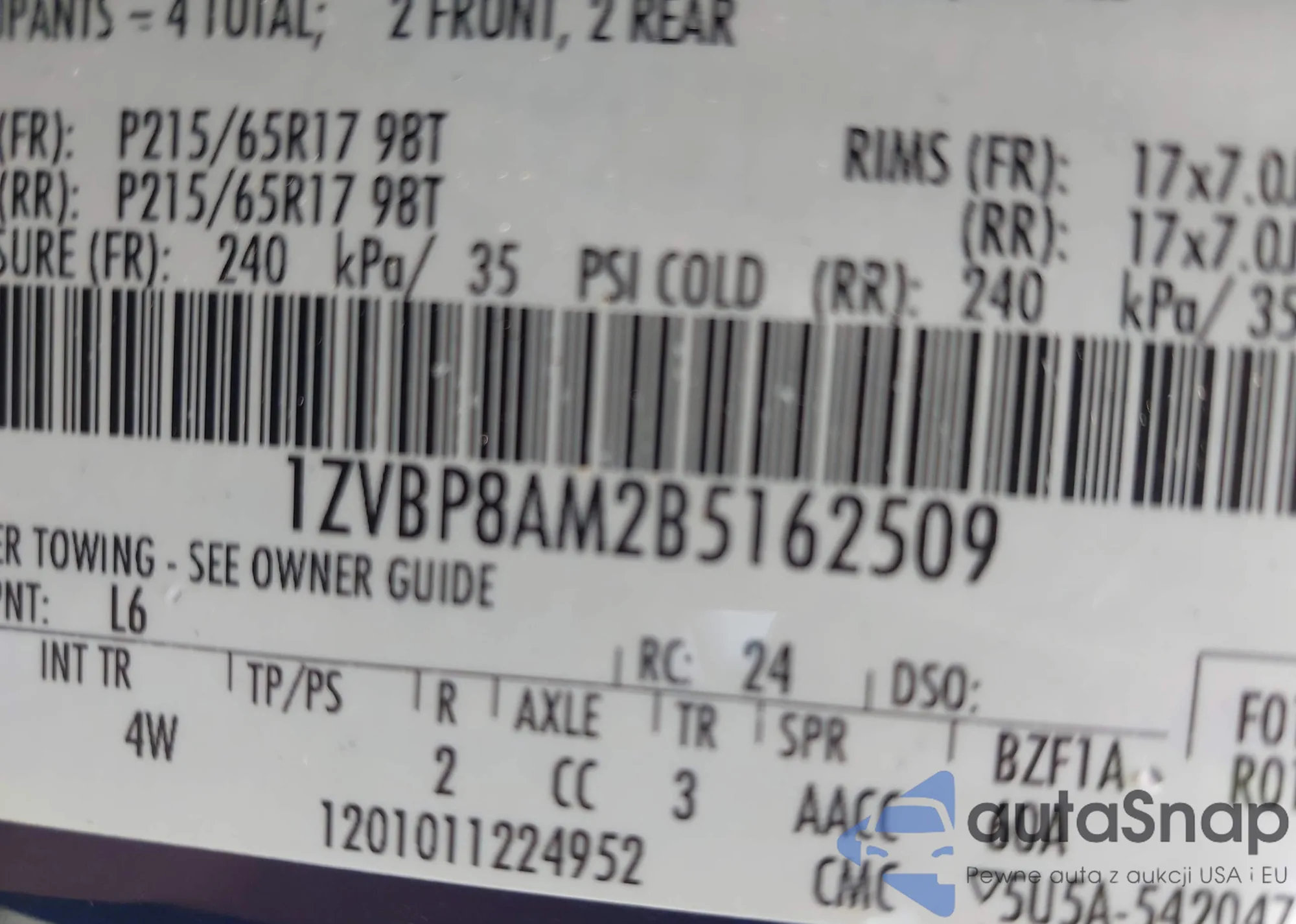 • VIN 1ZVBP8AM2B5162509