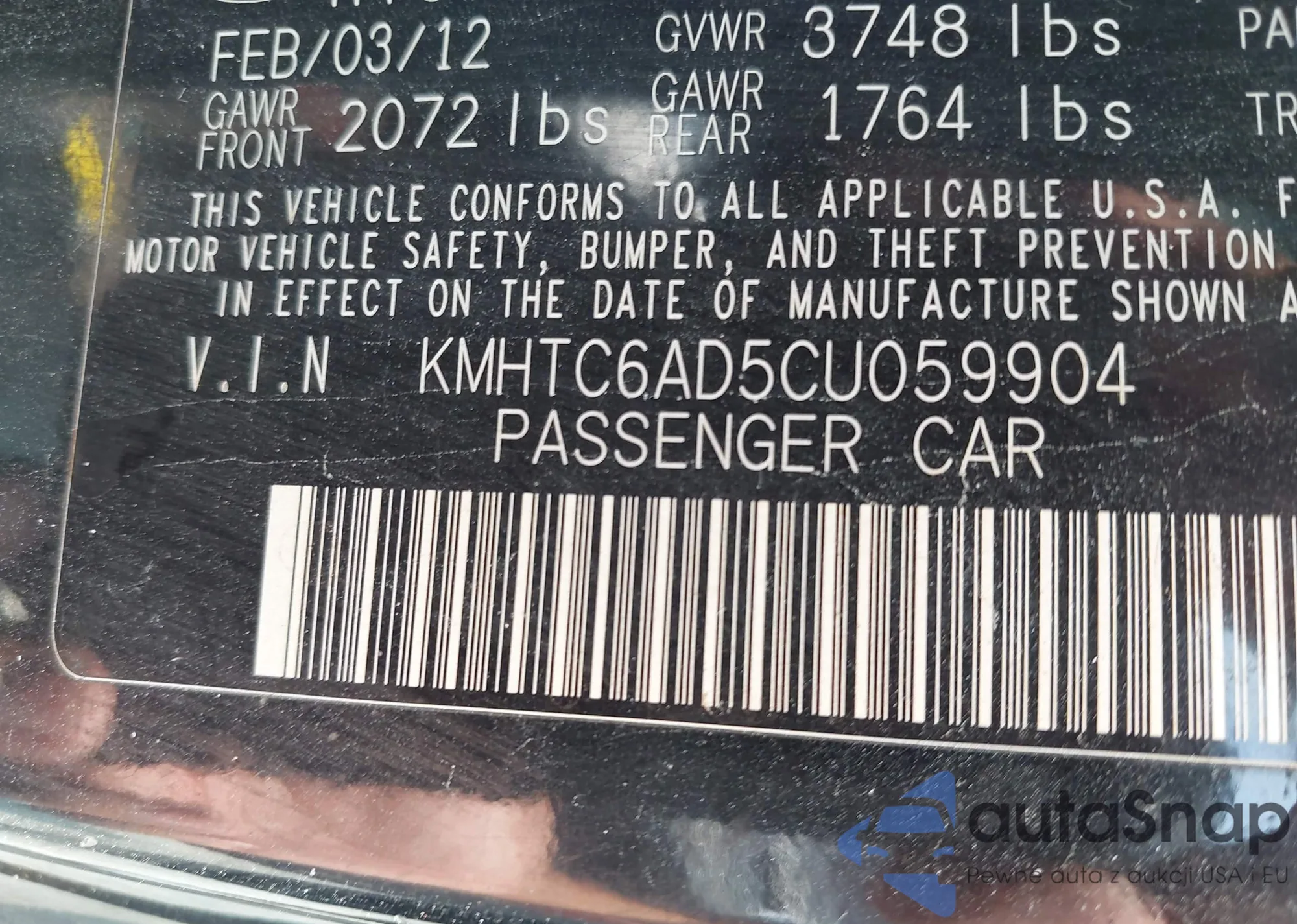 LOT: 43142230 VIN: KMHTC6AD5CU059904