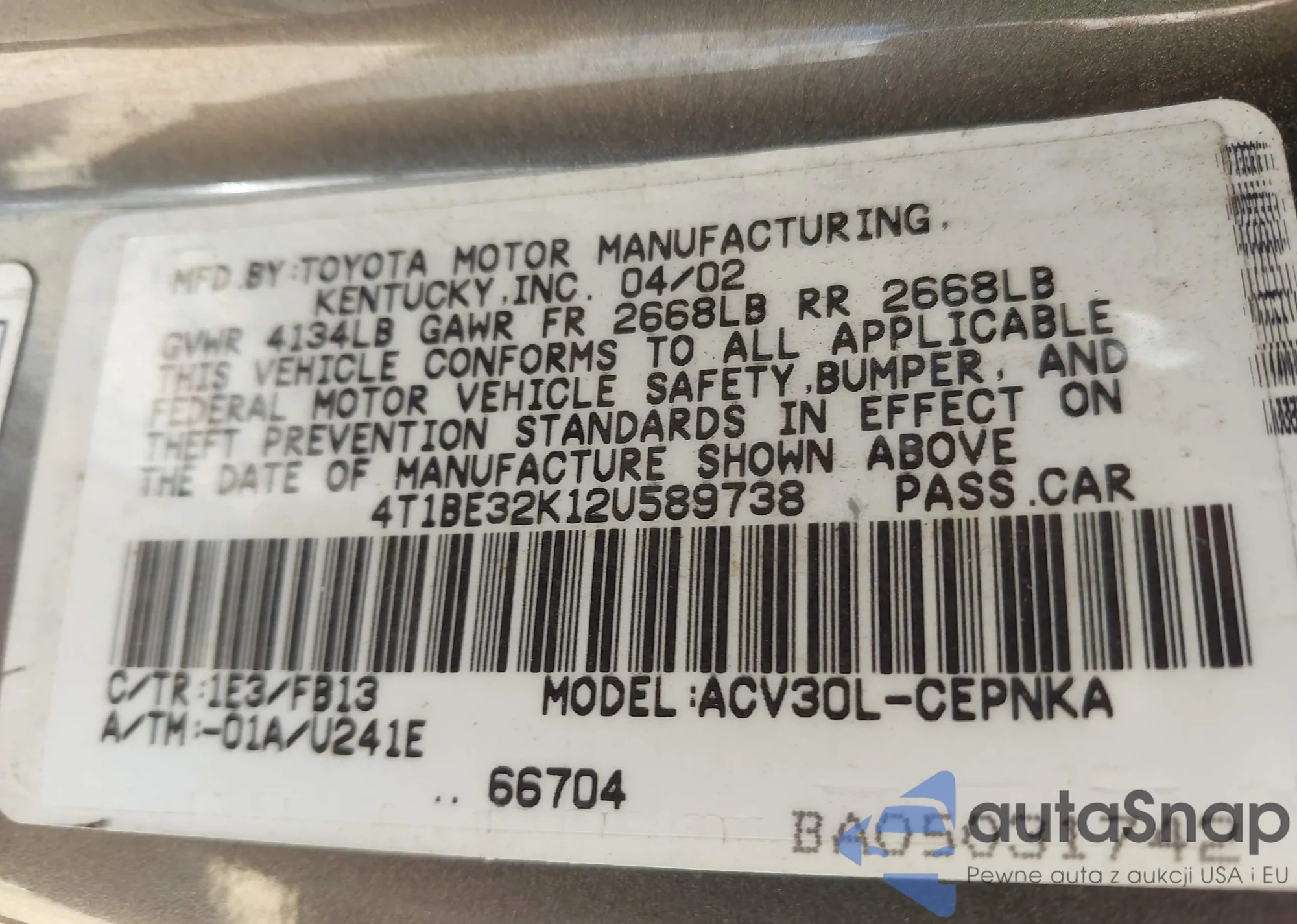LOT: 43171536 VIN: 4T1BE32K12U589738