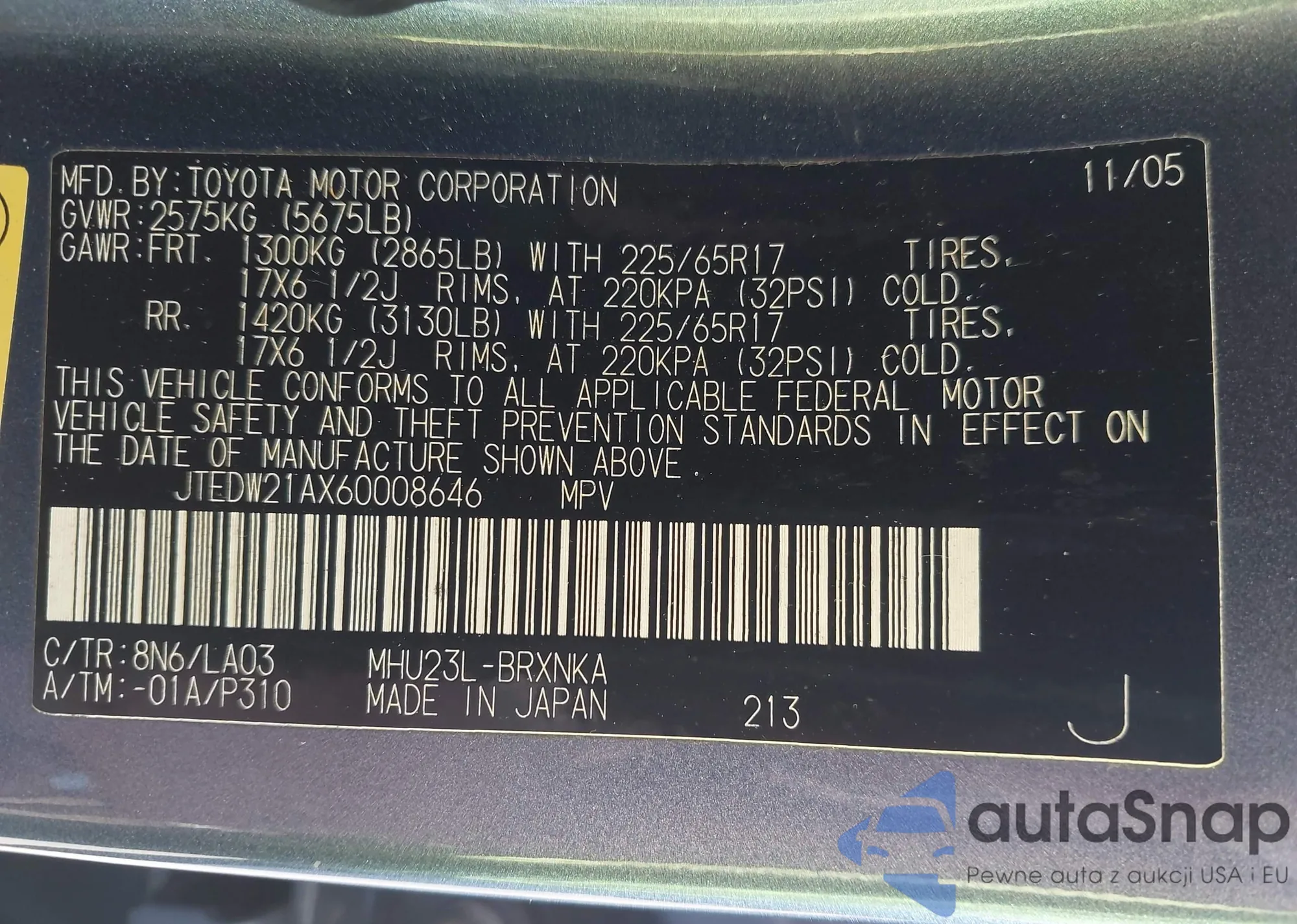 • VIN JTEDW21AX60008646